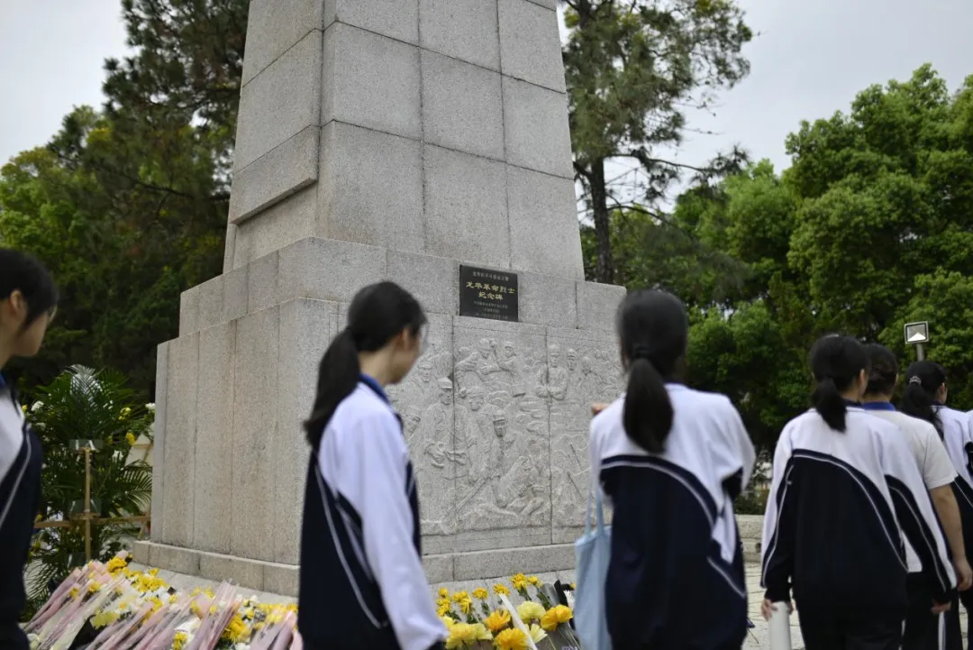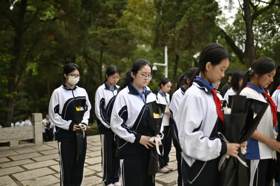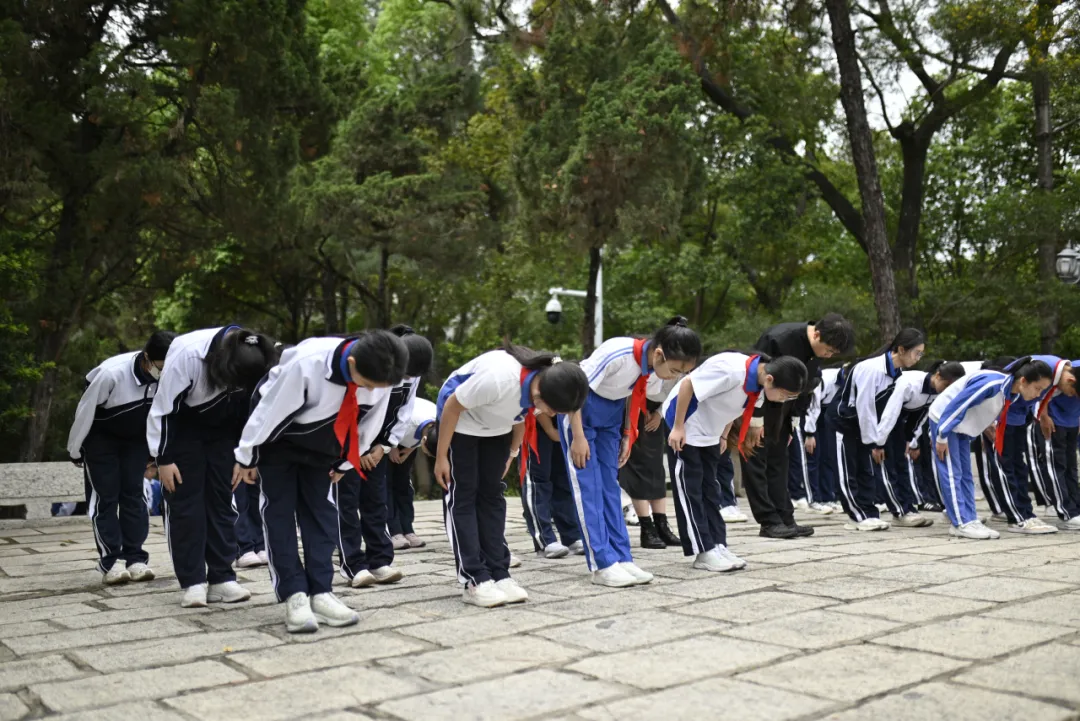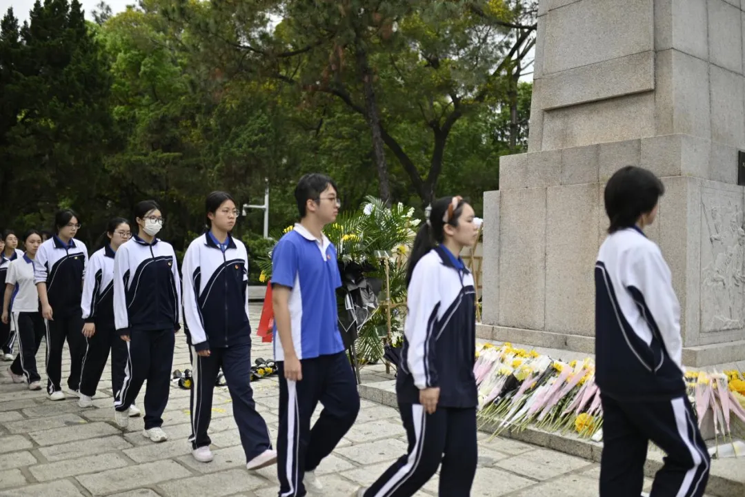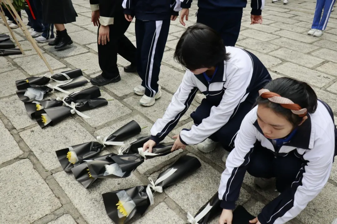 全体师生依次缓步走向纪念碑,手持鲜花轻轻放在碑前,躬身鞠躬,用最朴素的方式,表达对革命先烈的深切缅怀与崇高敬意。