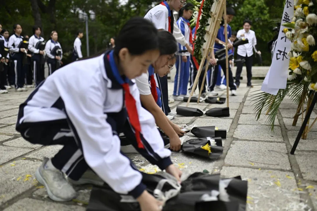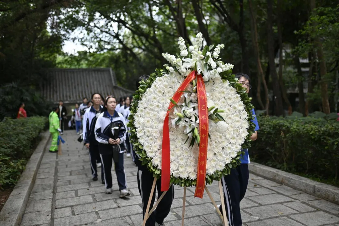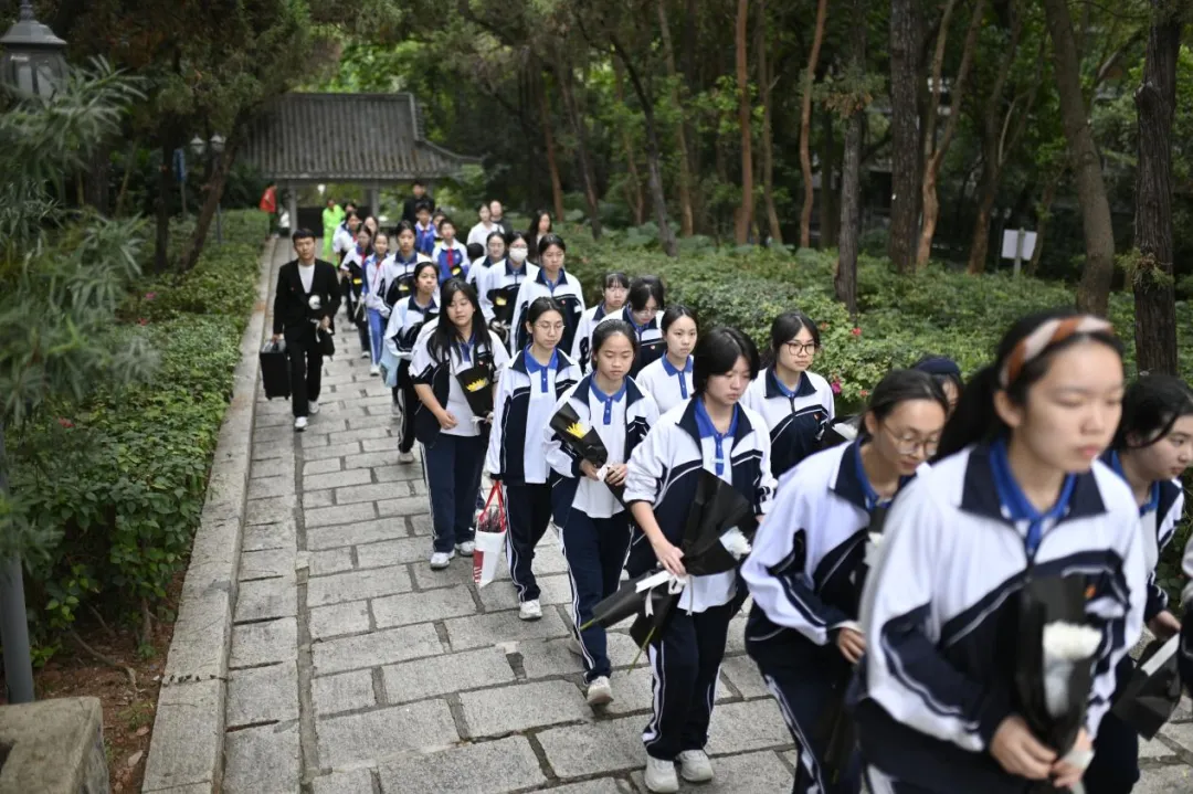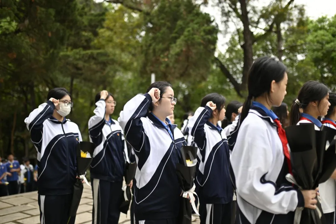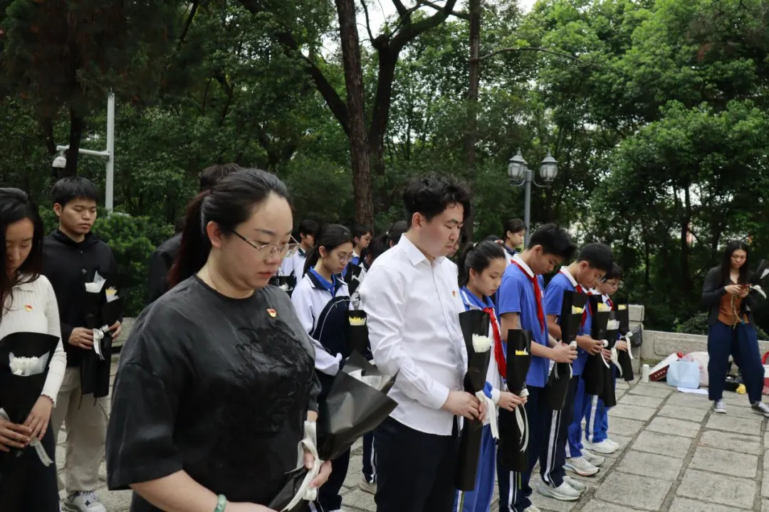 全体师生依次缓步走向纪念碑,手持鲜花轻轻放在碑前,躬身鞠躬,用最朴素的方式,表达对革命先烈的深切缅怀与崇高敬意。