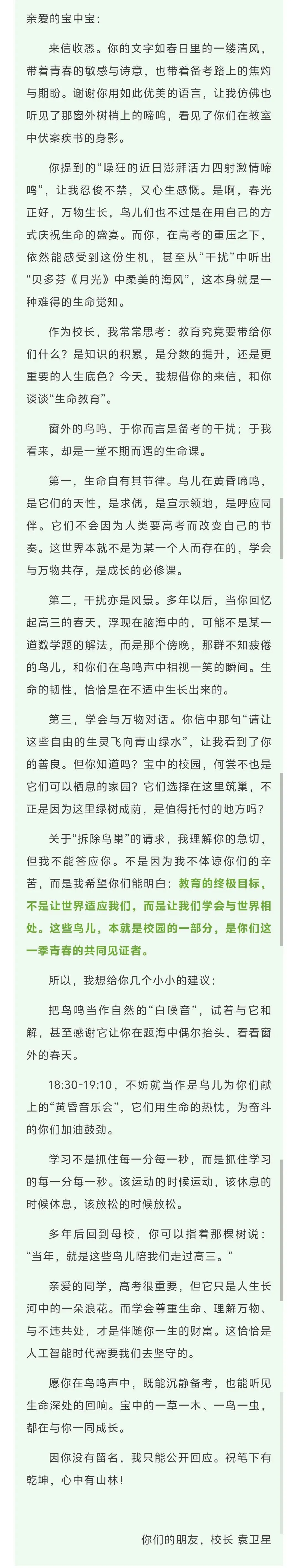 袁校长写道:“生命自有其节律。鸟儿在黄昏啼鸣,是天性,是求偶,是宣示领地,是呼应同伴。它们不会因为人类要高考而改变自己的节奏。”