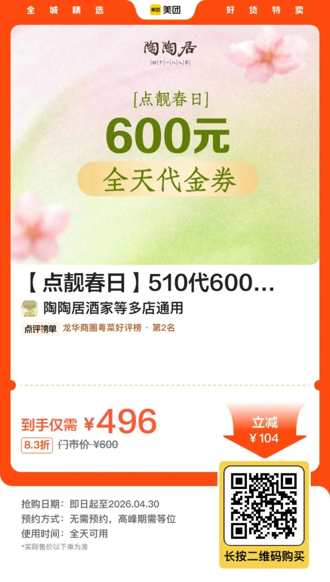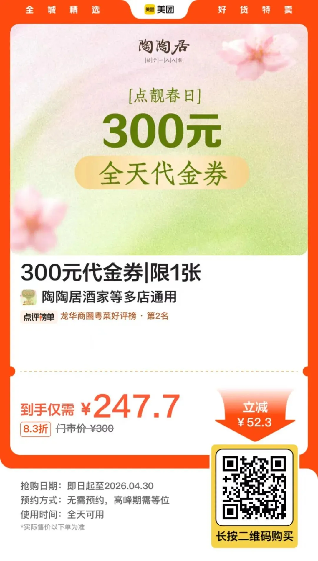 陶陶居很久没上活动了 3张*200元券包,相当于151代200,用不完可以申请退款的