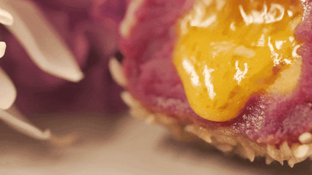 手打紫薯泥+金沙咸蛋黄的神仙组合,裹上一层脆米后高温油炸。入口先是酥脆,而后齿间陷入绵软,绵密细腻的流沙缓缓攻入舌尖,层层叠加美味递进,略带奶香。
