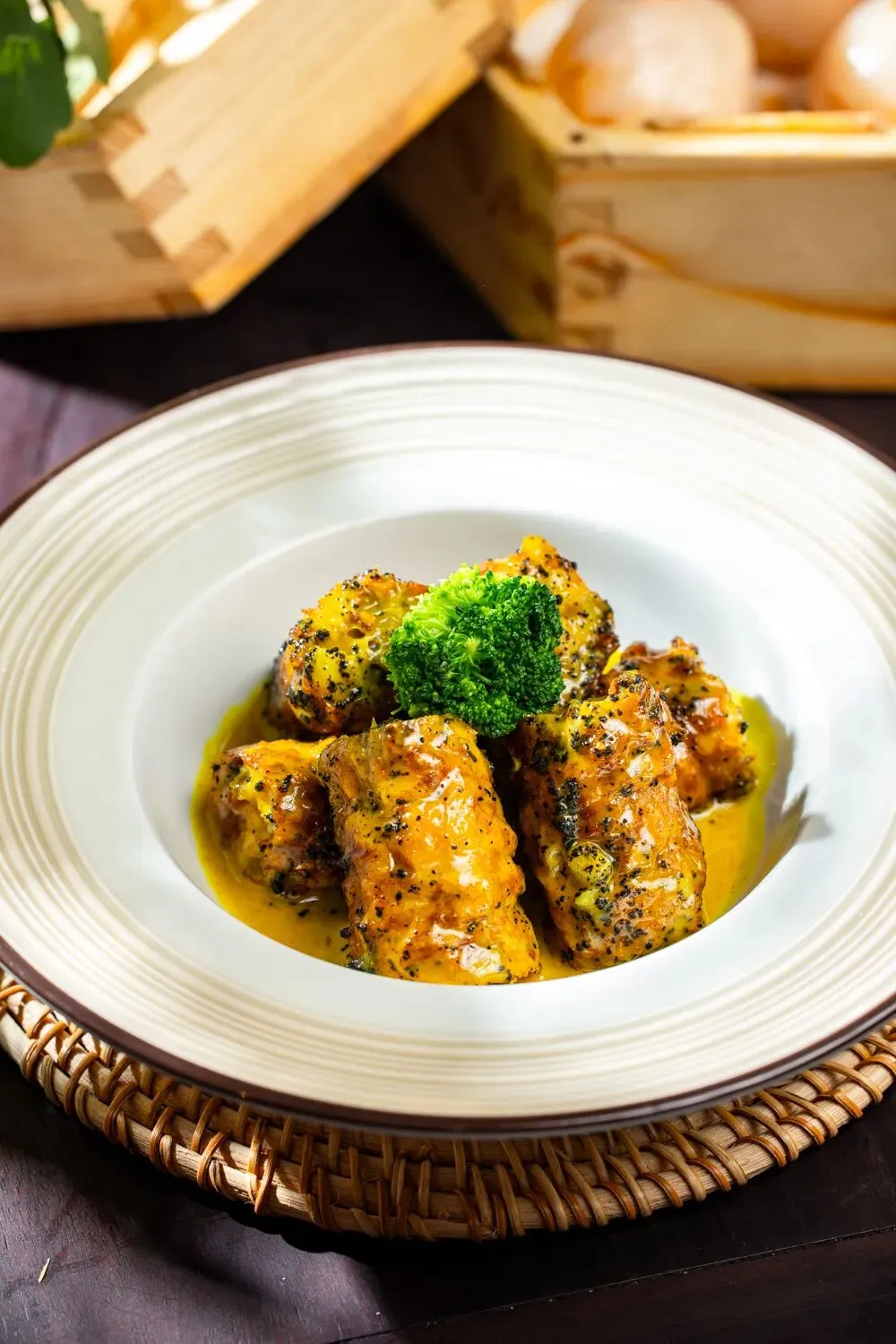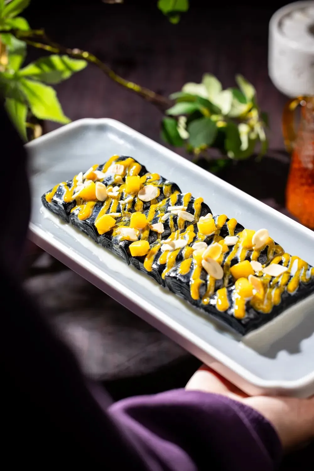 传统潮式点心酥粿,以猪肉、马蹄、冬菇等食材做成的肉卷,再融合黑松露特调葡汁,口口酥香,咸香椰香不断碰撞,一口便唇齿留香,令人回味。