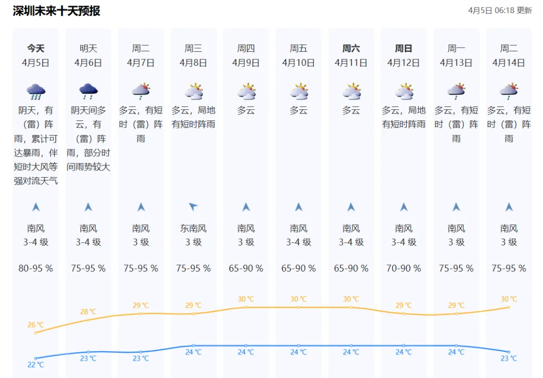 5日阴天,阵雨频密,累计雨量可达暴雨,雨时伴有雷电、8级或以上短时大风等强对流天气,气温22-26℃;