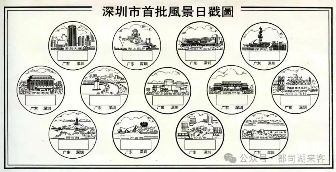 1995年1月31日深圳市邮政局启用了第1批风景日戳,入选景点有国贸大厦,海上世界,深圳火车站,深圳机场,罗湖海关、皇岗口岸、大亚湾核电站,锦绣中华,中国民俗文化村,西丽湖,石岩湖,沙头角,深圳水库共13处。