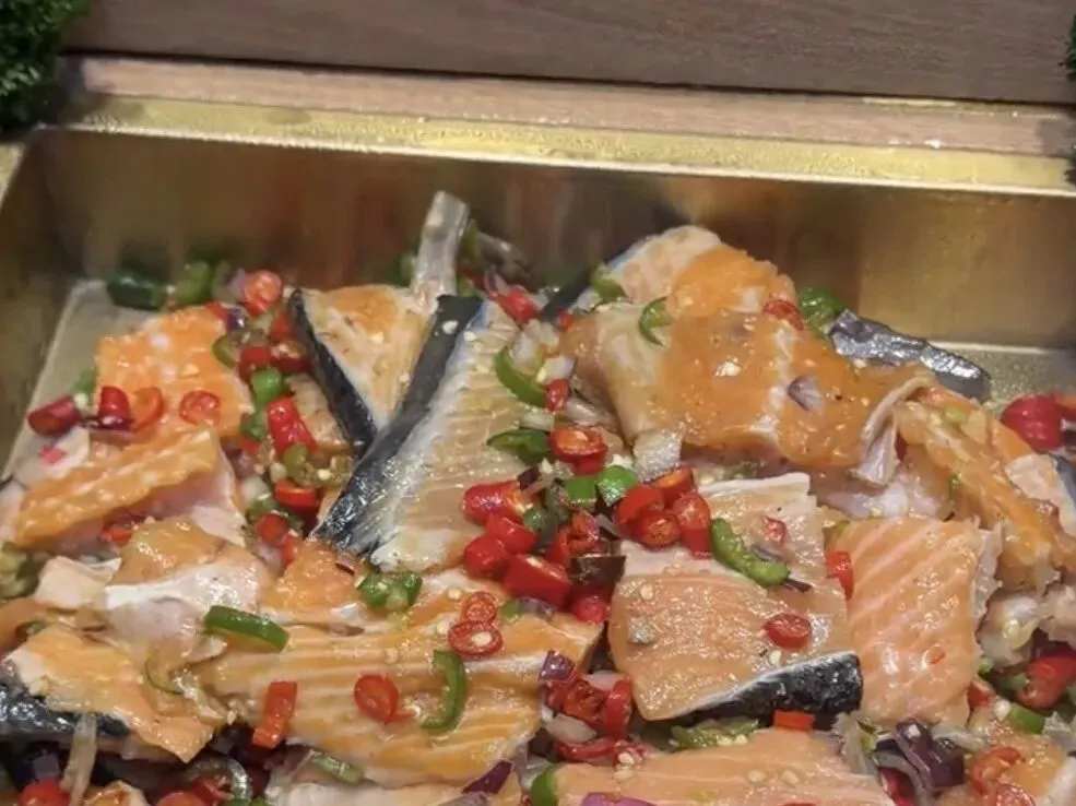 三文鱼排也十分新鲜,放在烤盘上慢慢煎至两面金黄,外皮酥脆,内里鲜嫩,入口即化,鱼鲜味十足。