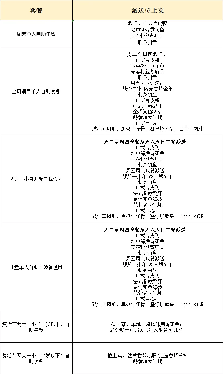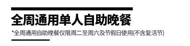 ·全周通用自助晚餐仅限周二至周六及节假日使用(不含复活节)