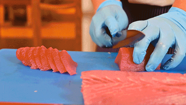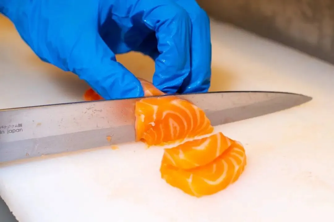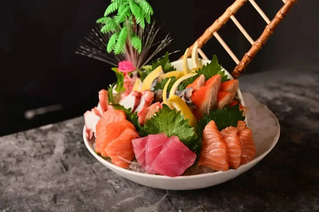 现点现切的进口三文鱼、希鲮鱼、金枪鱼