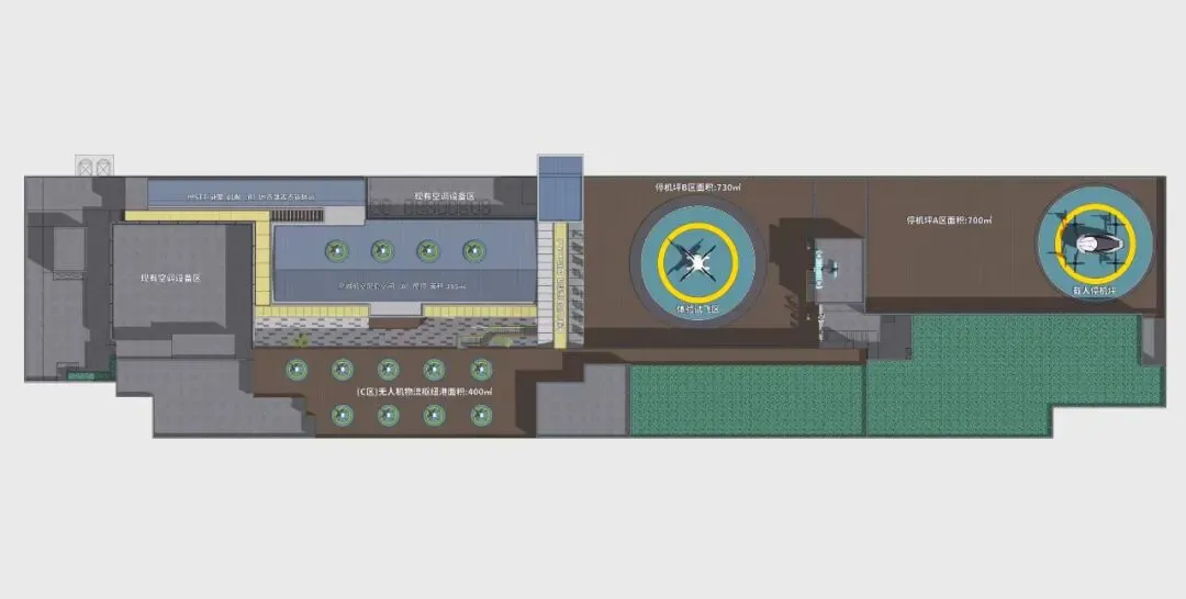 而同样作为企业提前布局的重要成果,华强北的顶楼低空商业综合体正在火热建设中。该综合体规划极具前瞻性与创新性,建成后将集载人飞行区域、无人机物流枢纽港、体验试飞区域等多功能于一体。其中,载人飞行区域能够满足直升机、eVTOL等载人飞行器的起降需求,为城市低空交通搭建起关键节点;面积达400㎡的无人机物流枢纽港,配备多个起降位,将大力推动无人机物流配送的高效运作,实现货物的快速周转;体验试飞区域则为各类低空产品的测试、演示以及用户体验活动开辟专门场地,助力新产品、新技术在实际场景中的验证与优化升级。