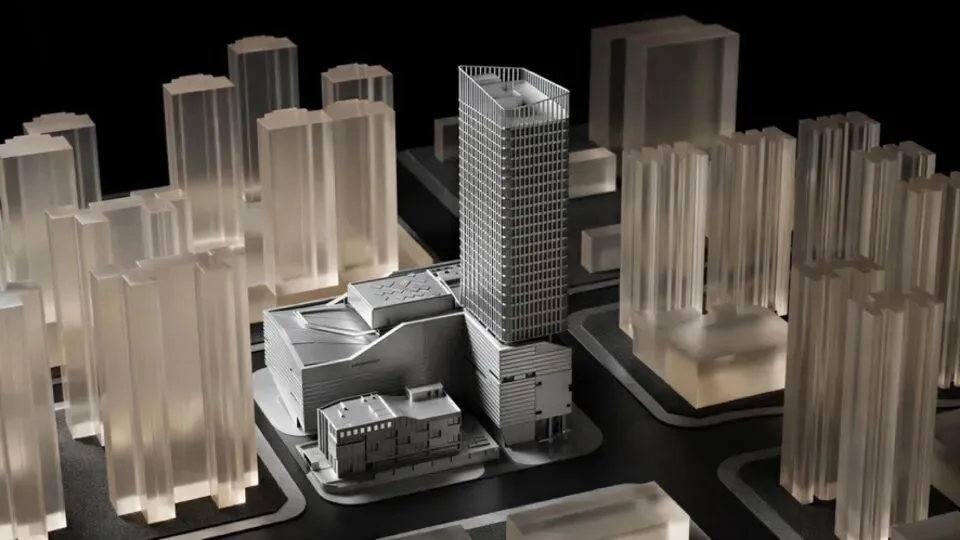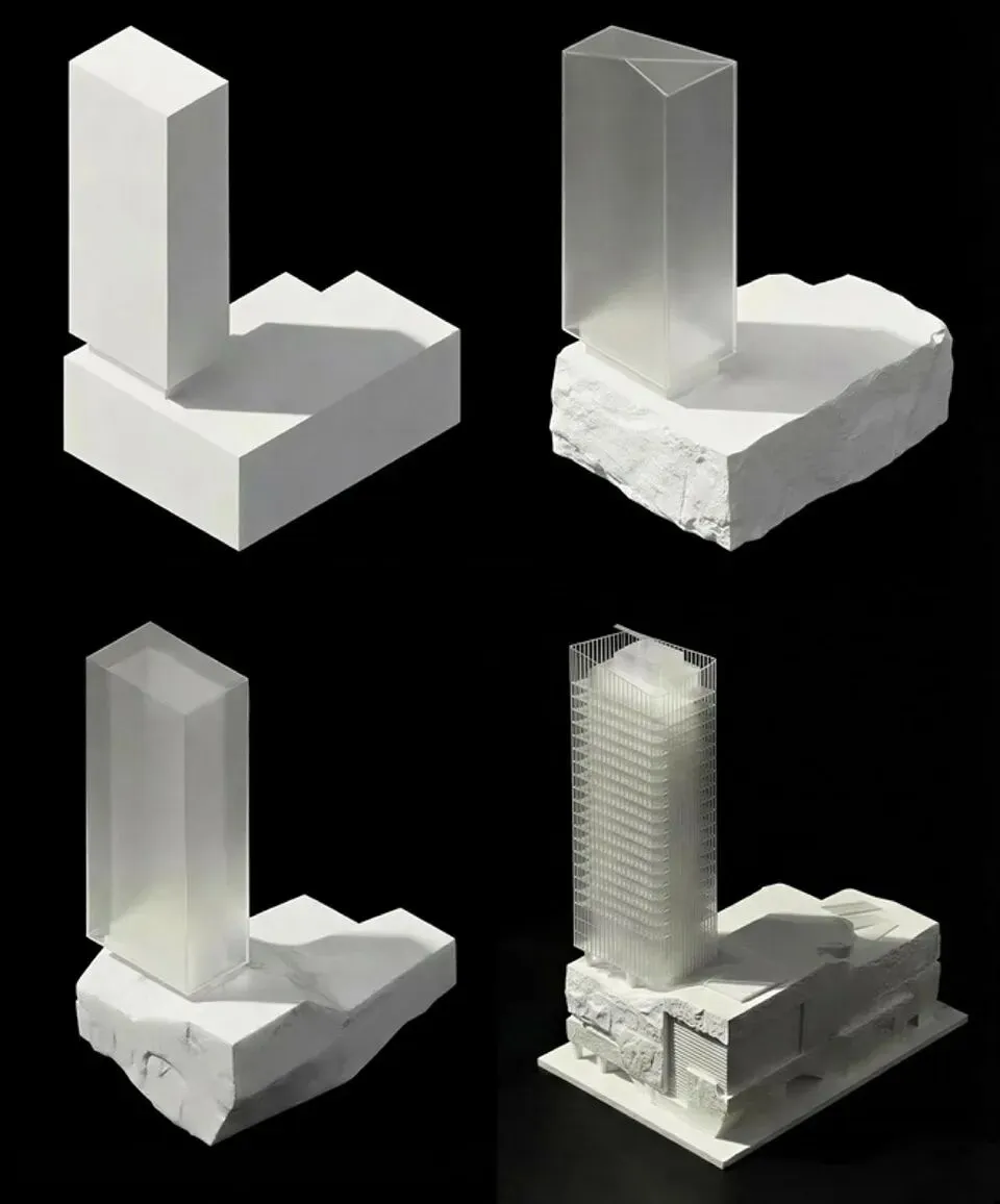 设计的叙事始于“艺术山林”这一核心概念,通过对开采断崖的坚实层理感与垂直切削的力量感的抽象转译,呼应片区所期待的文化开放与未来意象,将建筑体量转化为对自然地貌的物理重构。裙房如“山”,以厚重层叠的姿态锚固历史;塔楼似“林”,以轻盈挺拔的形体指向未来。这场“轻”与“重”的对话,既是形式与理念的二元起点,也构筑出一幅建筑与自然相互交融的精神图景。
