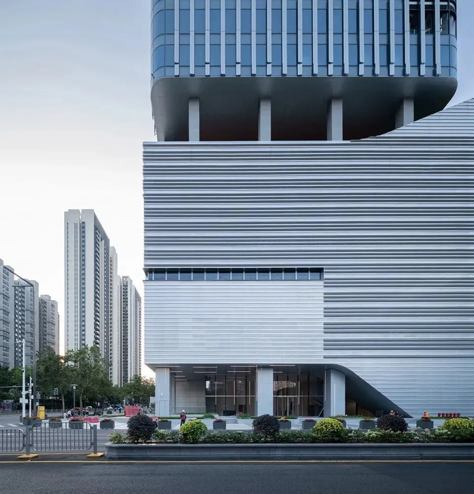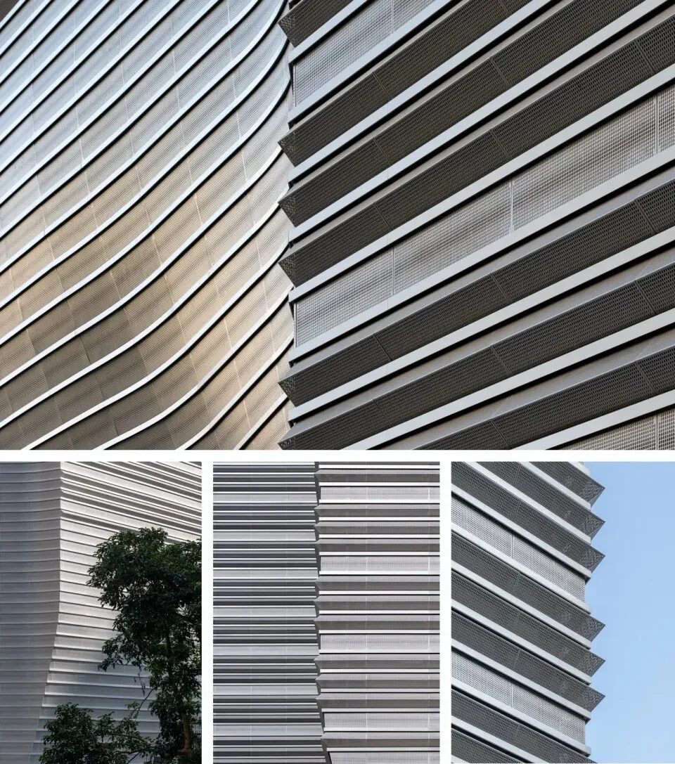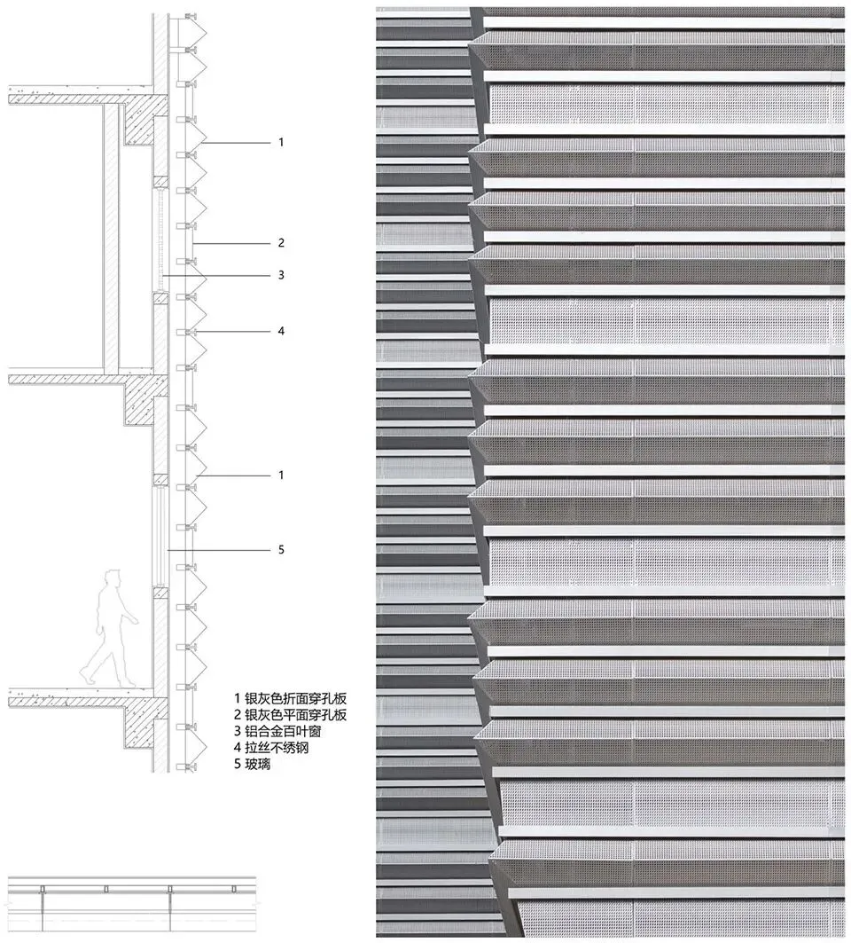 在材料与建构层面,设计也延续了“艺术山林”的叙事逻辑。裙房作为“山”的载体,其表皮系统历经多轮研究,最终选择通过直面与折面的银灰色穿孔铝板的拼贴肌理,形成如地质层理般富有张力与深度的肌理。