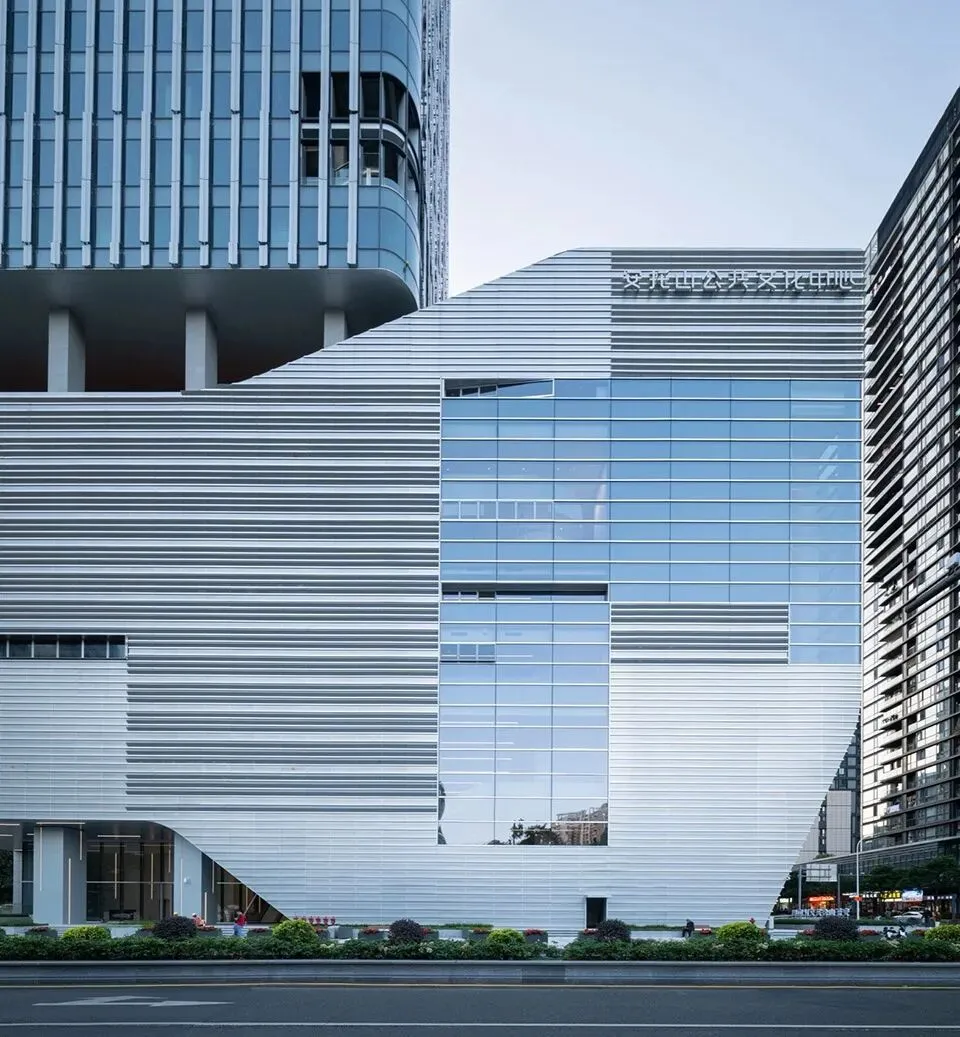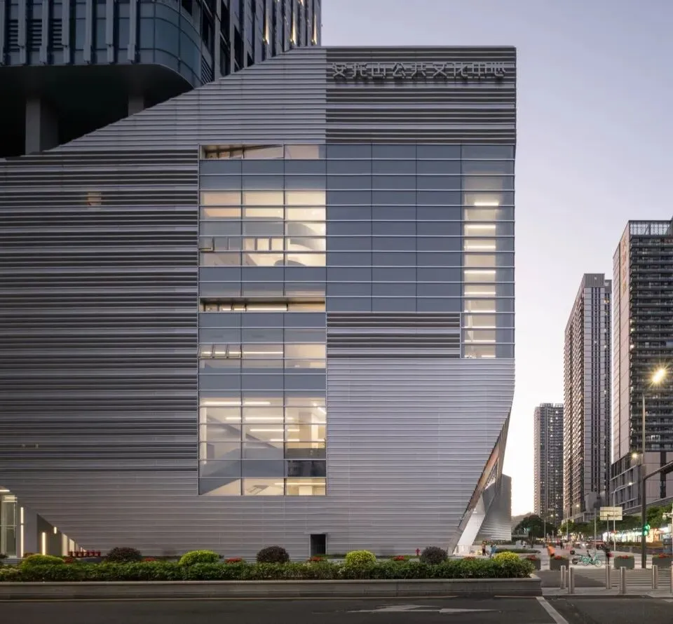 在细节语言上,文化中心裙房以厚重的横向肌理锚固大地,幼儿园则采用轻盈的竖向银白色格栅作为核心概念。在满足安全规范的同时,提供了通透的视野与柔和的光影过滤,营造亲切的尺度感与有机的共生感。