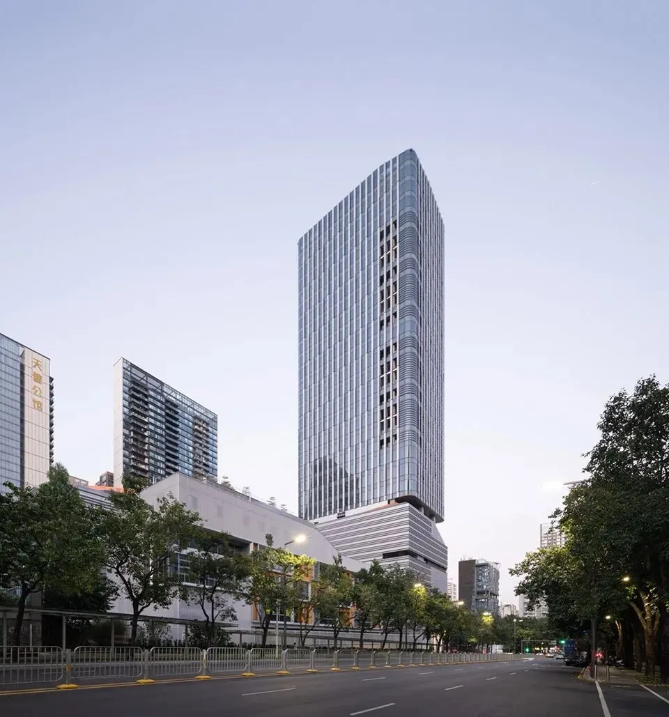 塔楼则通过强化竖向线条与通透的玻璃幕墙,呈现如林木般向上生长的轻盈姿态。它仿佛从“山体”中自然生长而出,不仅象征着面向未来的开放姿态,更在视觉上强化了建筑向天空延伸的动势,与周边自然绿意,天空与城市肌理相互映照。