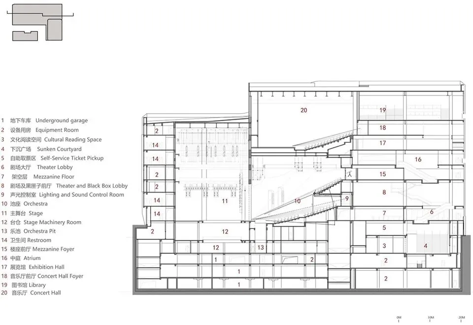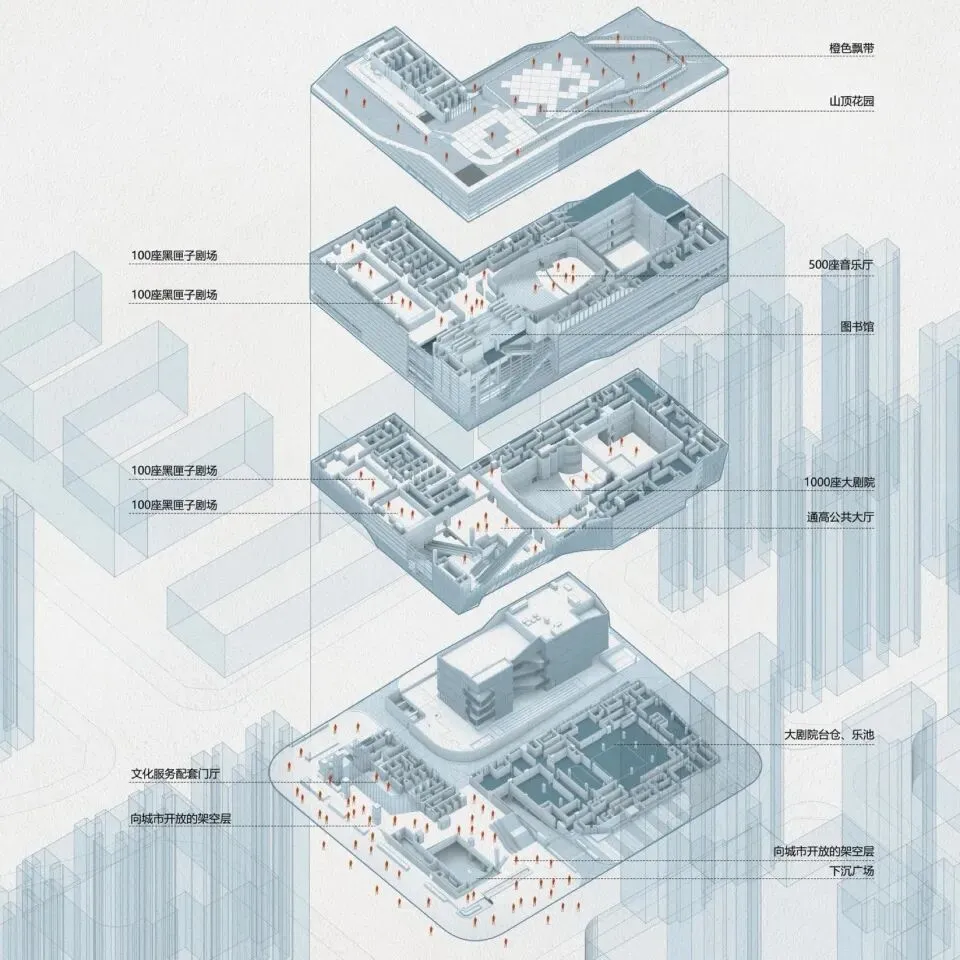 项目的核心挑战是高度紧张用地与高效率公共空间的博弈与整合。在约1公顷的用地内,需容纳超10万平方米的建筑体量。我们通过垂直维度的系统性整合,将大剧院、音乐厅、黑匣子剧场、图书馆、展览厅等功能立体叠合,形成高效复合的垂直文化聚落。