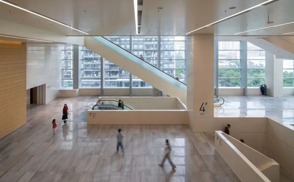 在地面与地下一层我们创造了南北贯穿的架空“灰空间”,为深圳的气候提供了遮阳避雨的休憩场所。同时,面向街道的开放界面打破了文化建筑的封闭,构建社区生活的核心舞台。这里没有围墙与闸机,市民可以自由穿行、小憩、观看街头表演,使文化建筑的边界彻底消融,成为社区客厅的自然延伸。