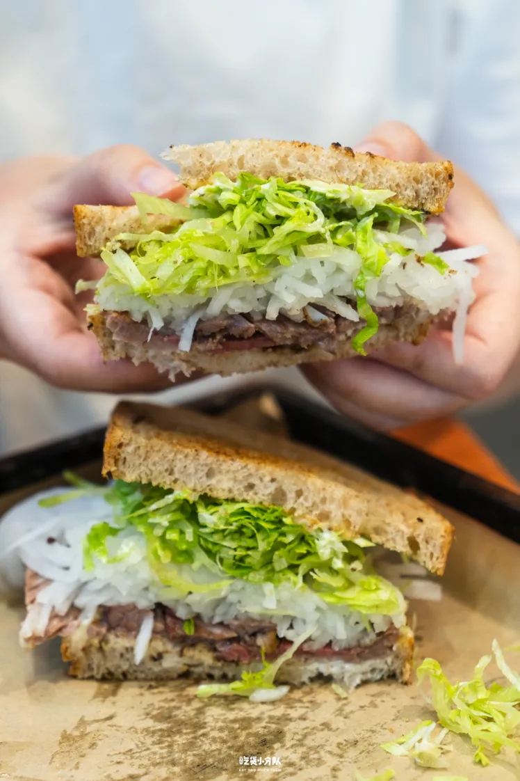 藏在宝树台角落的一家小店,不是老友推荐都找不到。他们家主打清真牛肉简餐,招牌就是一款「酸麦芽熏牛肉三明治」,两面烤至微焦的面包,细嚼有发酵的微酸,熏牛肉低温慢烤后,肉质浓郁且汁水丰满。搭配大把的生菜丝二含酸萝卜,中午吃一个晚饭都不用吃了。