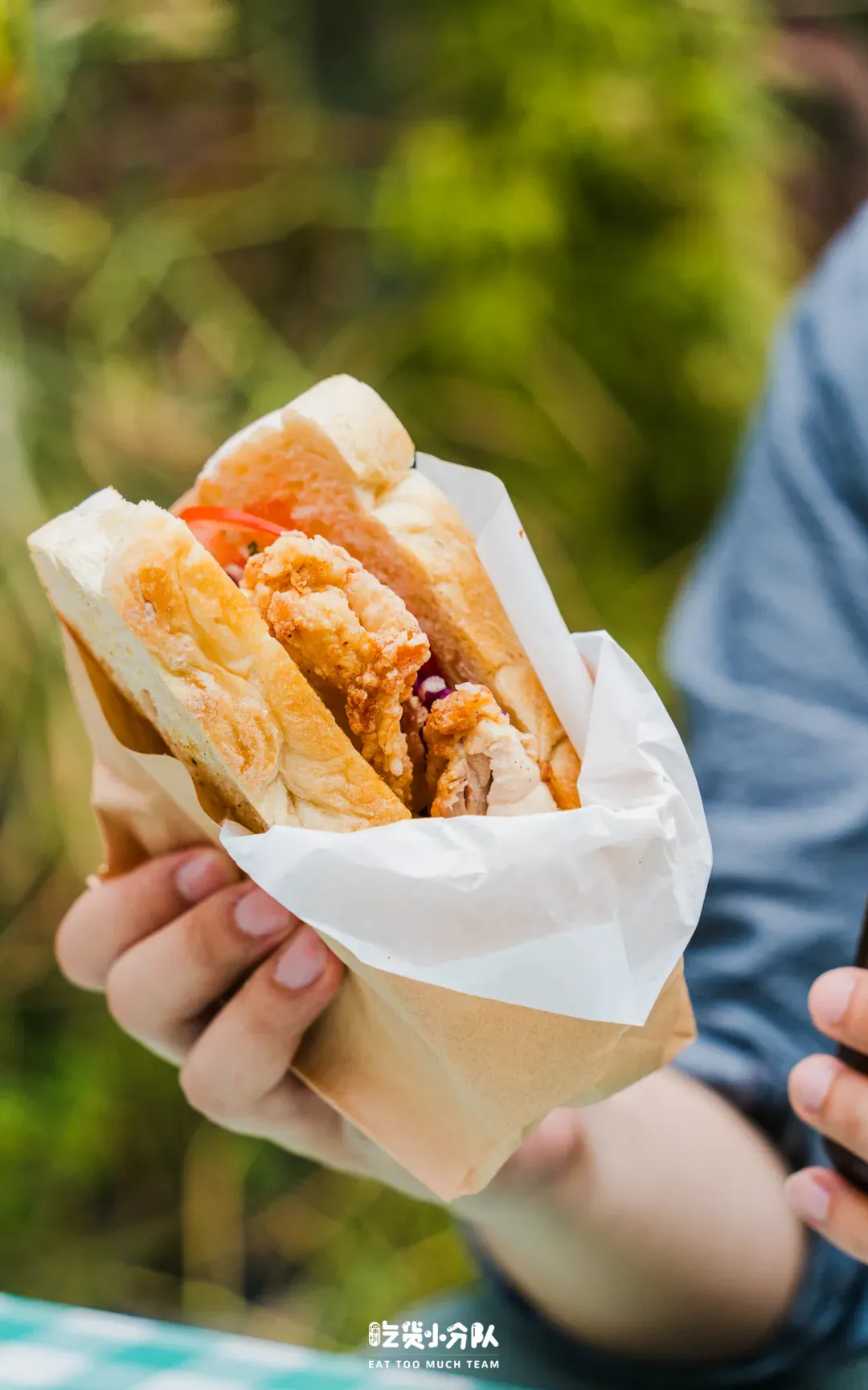 开在蛇口G&G的山雀烘焙坊,已经开了6年了,有不少回头客,他家的三明治,全部用的是自家做的面包,而且面包和夹馅的配菜都可以自己搭配。酸面包它的外皮通常比较硬脆,里面却很松软有嚼劲,内馅我们选择了比较有特色的“炸鸡”,巴掌大的鸡排炸得外脆里嫩,咬开还有汁水,搭配车达芝士,吃起来更罪恶了。