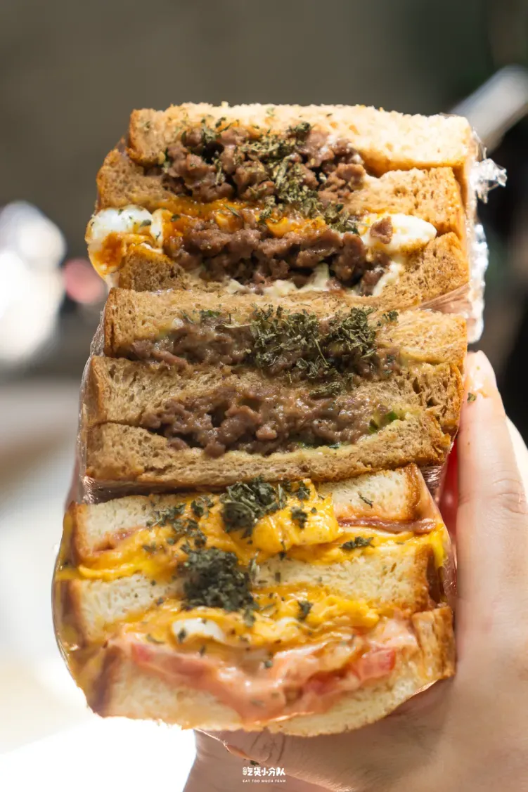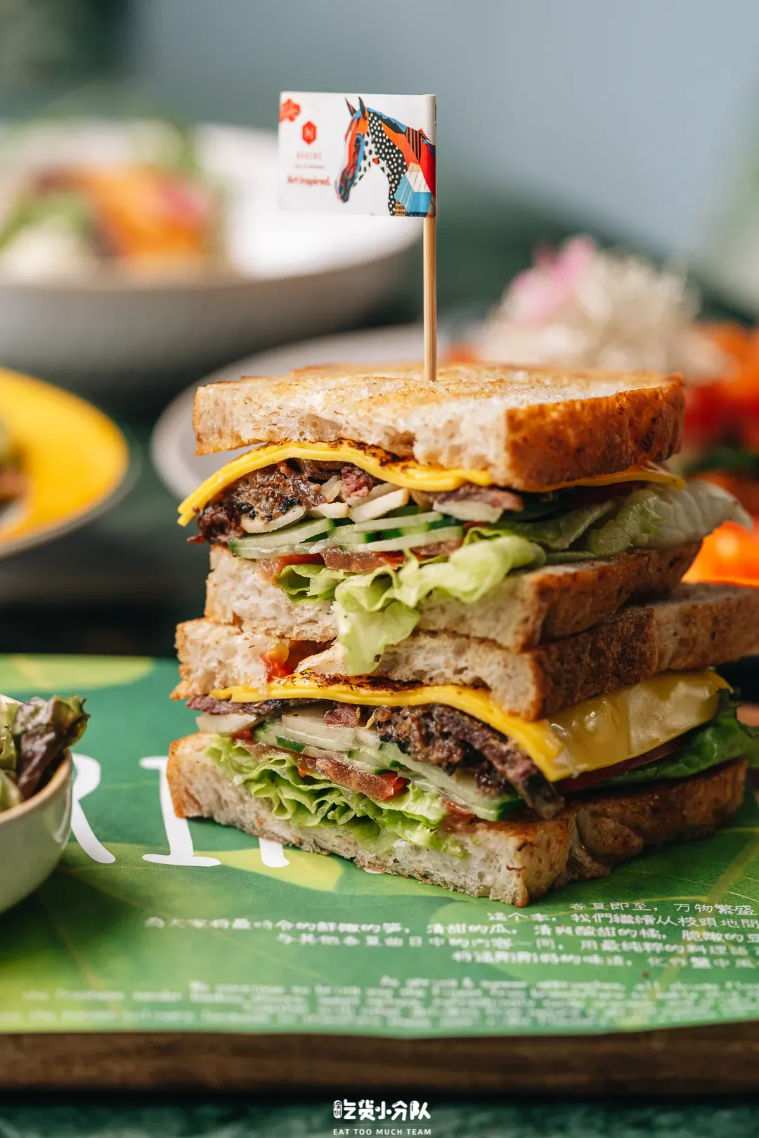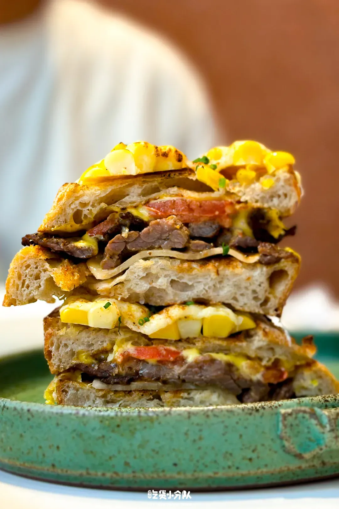 pLeace除了热香饼,三明治也是很多人的心头爱。这款沙茶牛肉三明治,双层烤的香脆的面包,夹层是沙茶酱包裹的牛肉,吃起来浓香可口,顶层点缀的焦糖玉米,清爽解腻,整体口感很丰富。