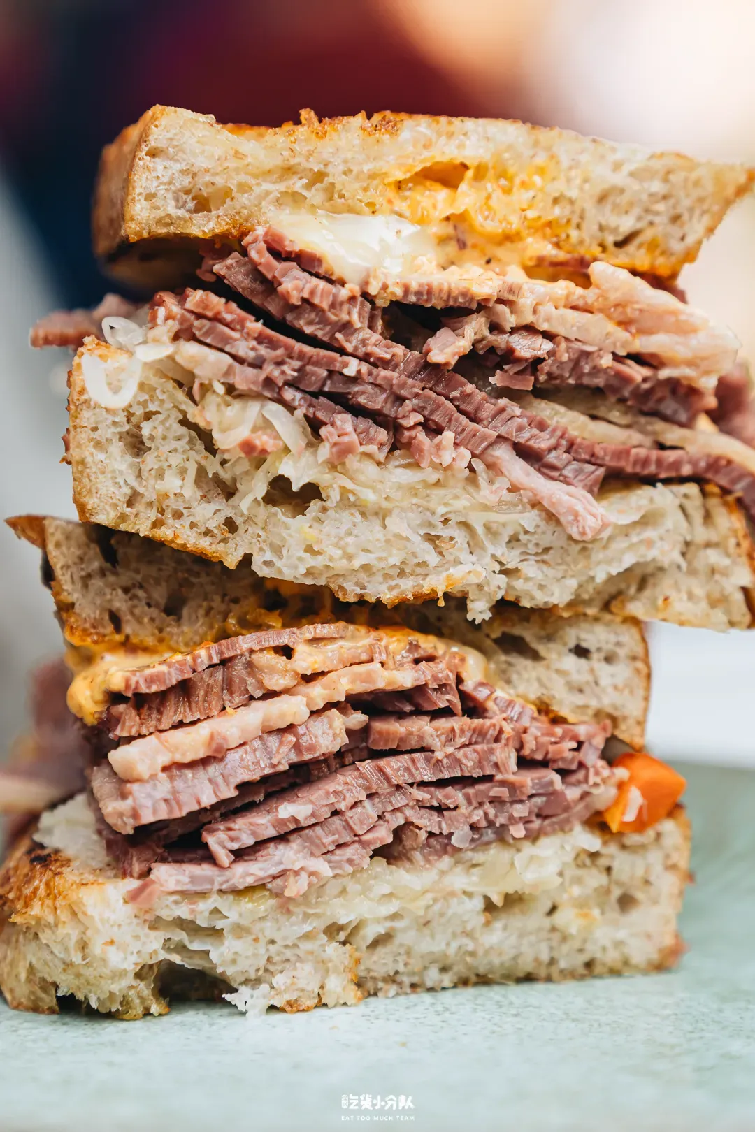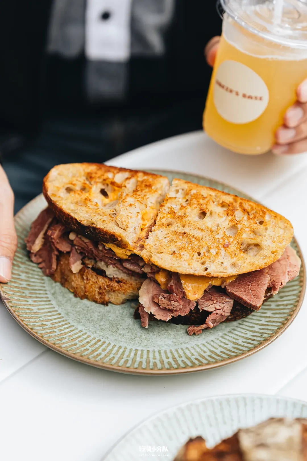 梅林人都知道的老牌烘焙店Baker's Base,新店开到了文艺气息十足的华侨城创意园53街区,新店增加了现做三明治&披萨。「鲁本牛肉三明治」是人气款,腌制的牛胸肉以果木烟熏的形式呈现,夹在现烤欧包里,还有酸菜和法式芥末酱的加持,吃着很juicy,不会腻。