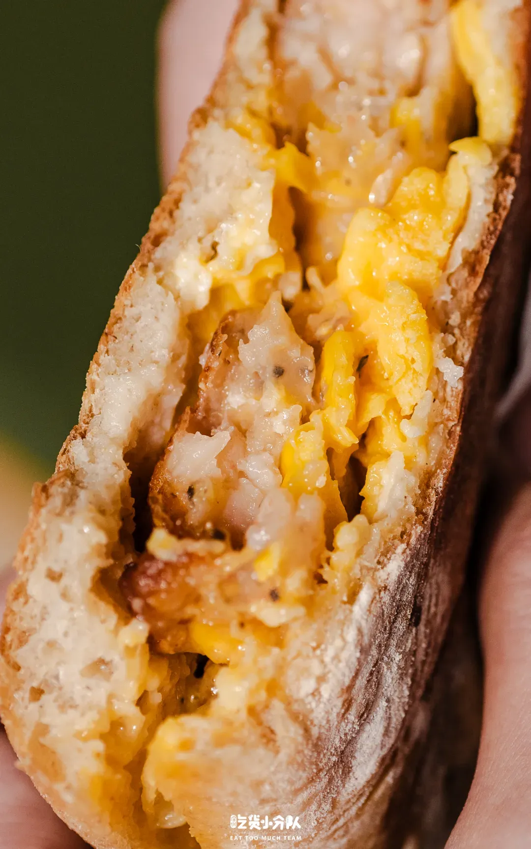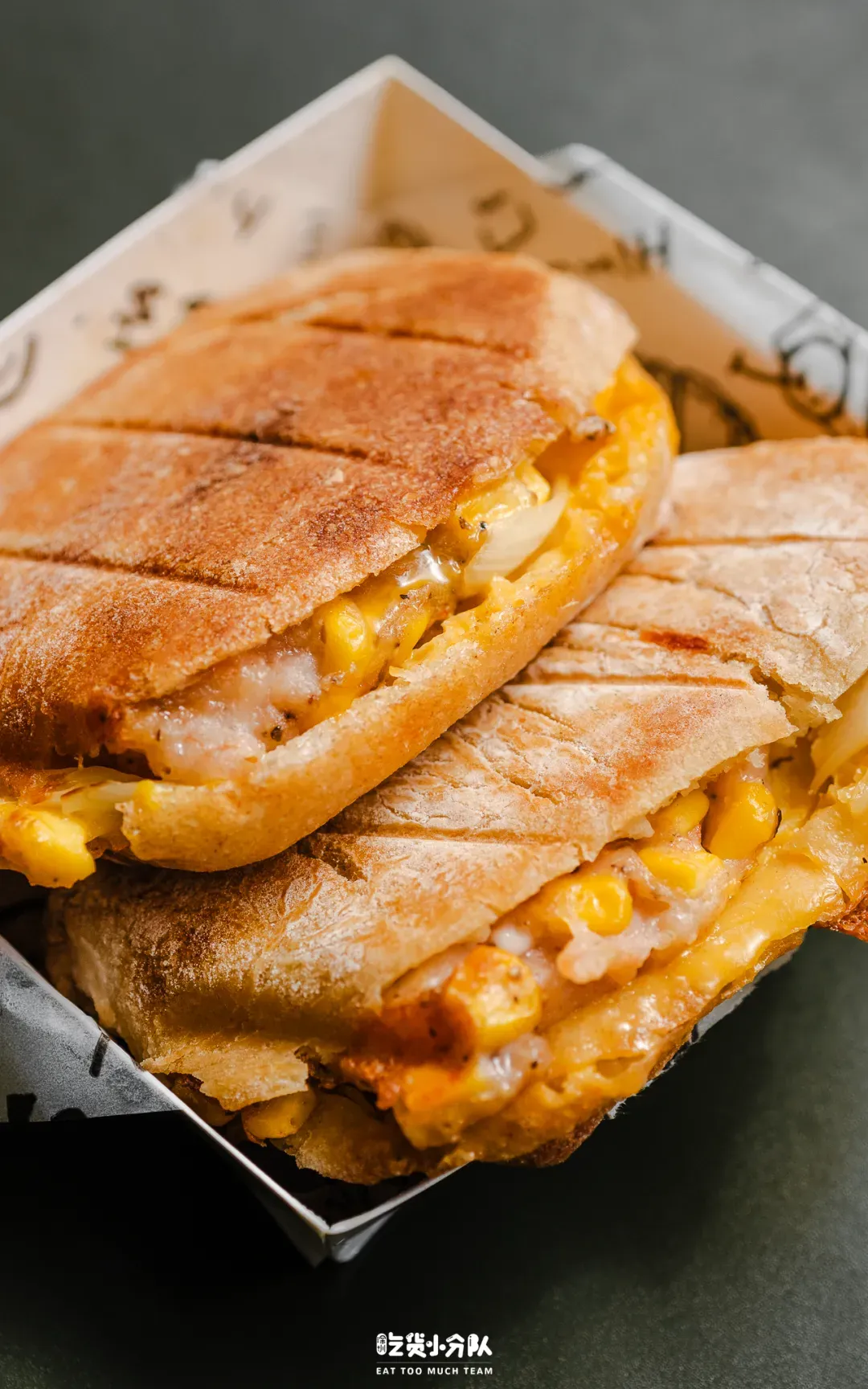 他家有很多款热压三明治,其中这款“滑蛋虾滑”是人气款。热压过后,整体非常扁,恰巴塔的大气孔基本都被排掉了,夹馅的滑蛋、虾滑、玉米,更好地融合到在一起,这款很适合当早餐。