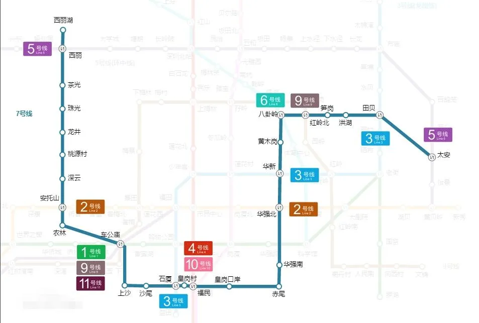 深圳地铁7号线。2016年10月通车,是轨道交通三期的重点线路之一。一期有30.2公里长,东西走向,从罗湖太安到南山西丽湖北门站,中间设了27个车站,其中12个换乘站,可直接换乘11条线,把南山、福田中心区和罗湖这几个核心区域连起来,西丽站、华强北还有深港地区也都在它的覆盖范围内。