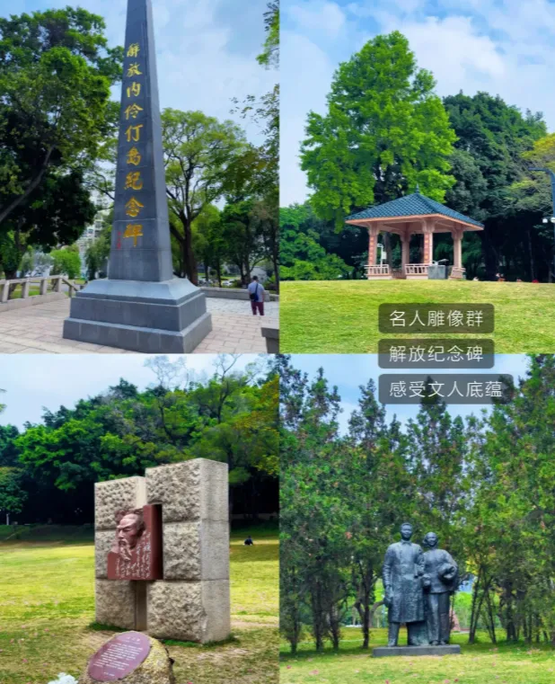园内有孙中山先生雕像、纪念馆及历史名人雕像群(如文天祥、林则徐等),展现爱国主义文化。🍃 · 🍃 · 🍃