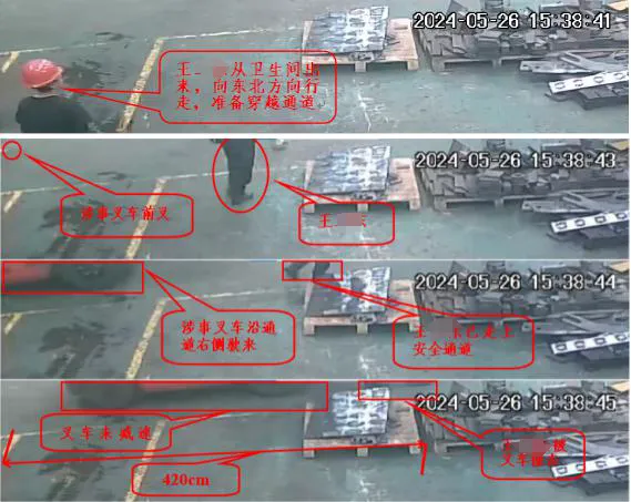 2024年5月26日15时38分许,涉事机械公司叉车司机宋**在完成正常卸货作业后,驾驶涉事车辆沿车间通道自西向东返回停车点途中将右前方突然步入车间通道的焊工王**撞倒。