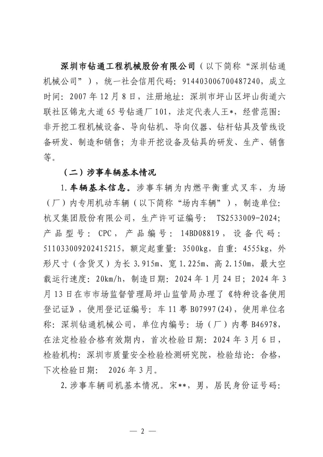 2.宋**,作为深圳钻通机械公司场内车辆司机,安全意识淡薄,驾驶车辆未按照生产车间规定的限速要求行驶,将王**撞倒致死,违反涉事车辆安全技术规范和公司安全操作规程,违反《特种设备安全监察条例》的有关规定,对事故的发生负有直接责任。事发后公安机关已对其立案侦查并采取了取保候审措施,建议由公安机关依据相关法律法规规定对其进行处理。