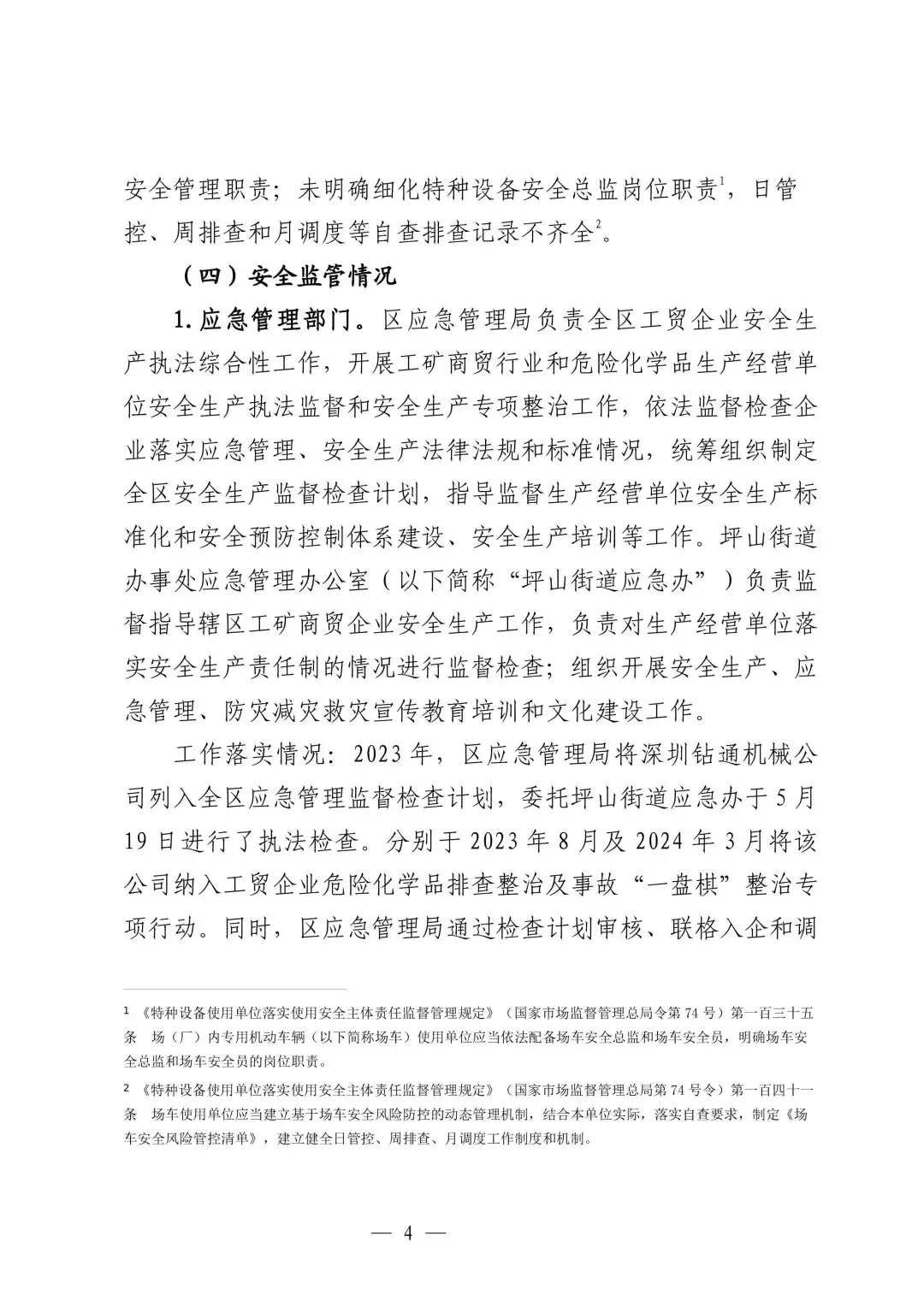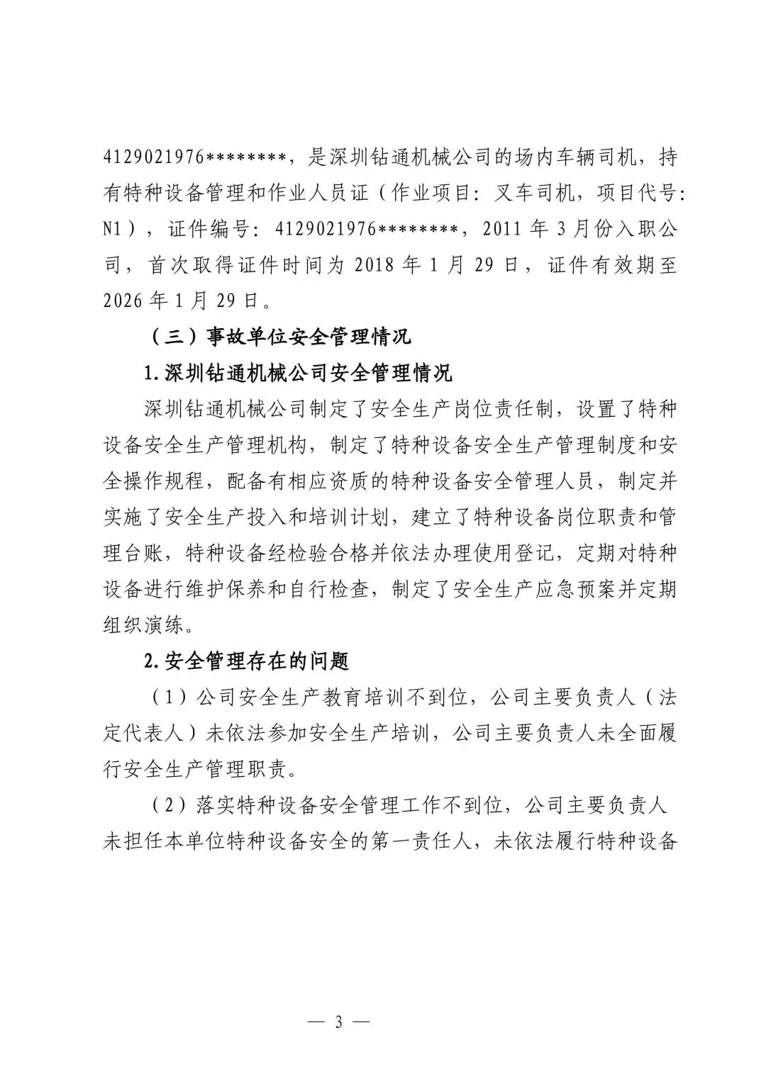 3.王*,作为深圳钻通机械公司法定代表人,未履行本单位主要负责人特种设备管理职责,督促、检查公司特种设备安全管理工作不到位,对事故负有管理责任,其行为违反了《中华人民共和国特种设备安全法》的有关规定,建议由市市监坪山监管局依据《中华人民共和国特种设备安全法》的相关规定对事故单位负责人进行行政处罚。△上下滑动查看▽
