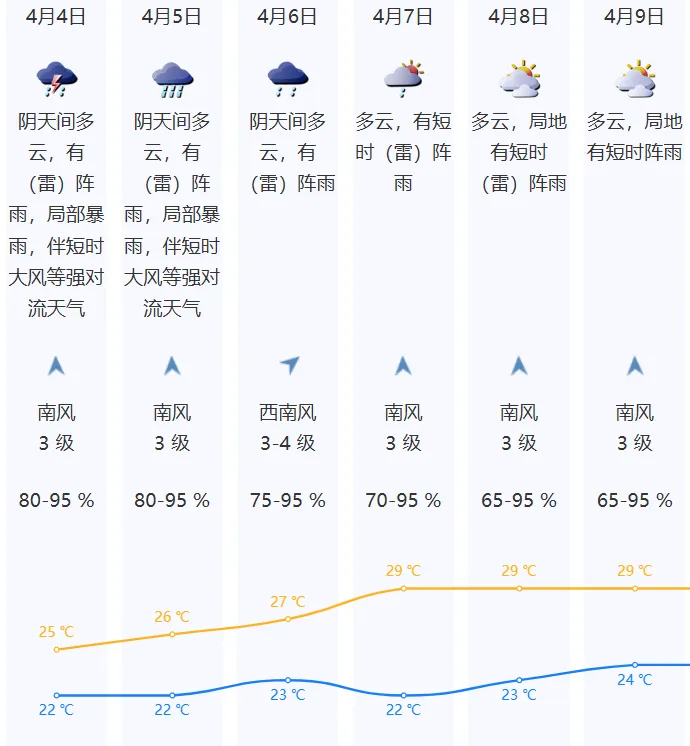 4日阴天,有雷阵雨,局部暴雨,雨时伴有8级或以上短时大风等强对流天气,气温22-25℃;