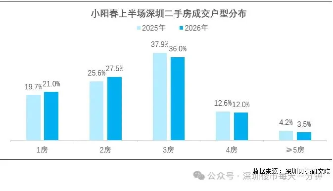 - 2026 年小阳春,1 房成交占比从 19.7% 涨到 21.0%,2 房从 25.6% 涨到 27.5%;