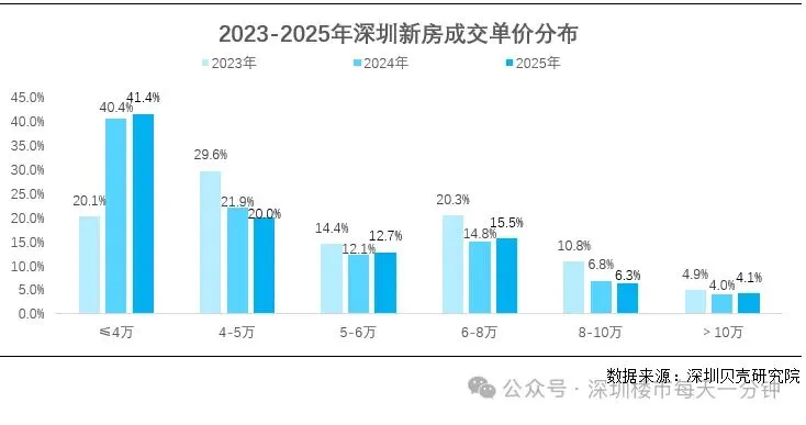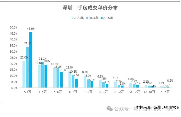 - 2023 年单价 4 万 /㎡以下的房子,只占 22.0%,2025 年直接涨到 45.9%,翻了一倍;