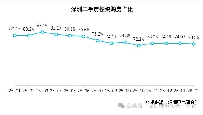- 2025 年 1 月还 80.4% 的人按揭买房,到 2026 年 2 月只剩 73.5%;