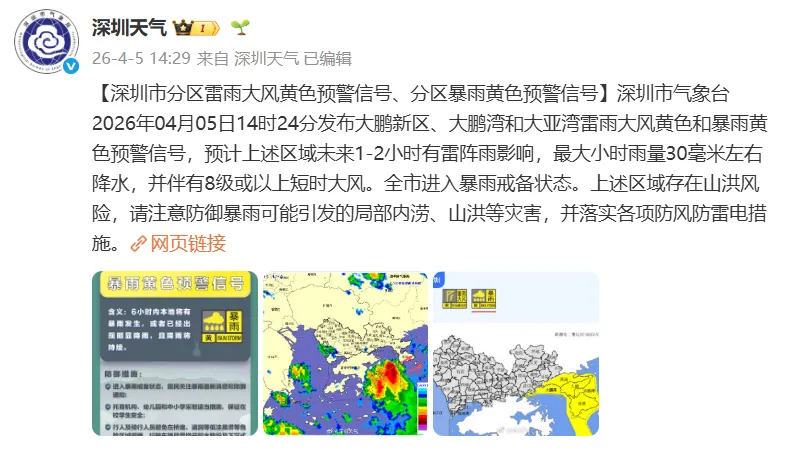 【深圳市分区雷雨大风黄色预警信号、分区暴雨黄色预警信号】深圳市气象台2026年04月05日14时24分发布大鹏新区、大鹏湾和大亚湾雷雨大风黄色和暴雨黄色预警信号,预计上述区域未来1-2小时有雷阵雨影响,最大小时雨量30毫米左右降水,并伴有8级或以上短时大风。全市进入暴雨戒备状态。上述区域存在山洪风险,请注意防御暴雨可能引发的局部内涝、山洪等灾害,并落实各项防风防雷电措施。