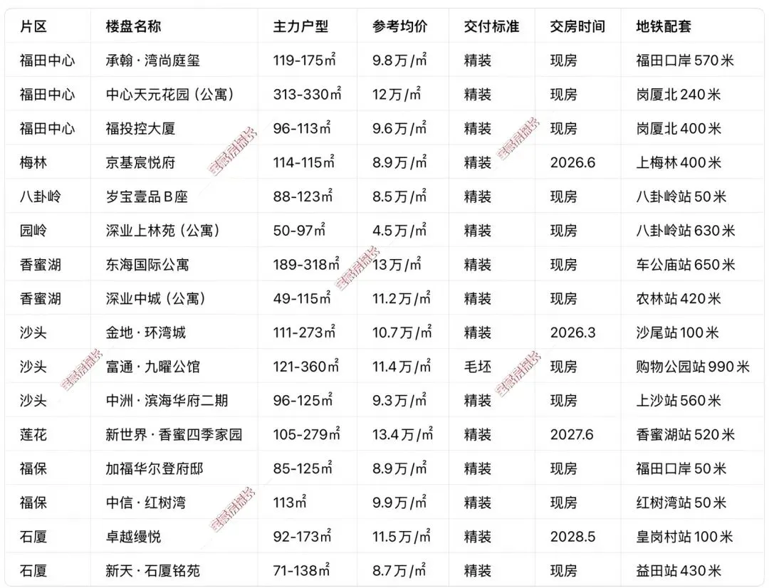 这份指南,彻底跳出了虚高的备案价,完全基于2026年一季度深圳10大区(福田、南山、宝安、龙华、罗湖、龙岗/坪山、光明、盐田、大鹏)的真实成交数据,按深圳主流购房预算做了清晰的总价段划分,把每个价位能买到的片区、楼盘、产品力,探长一次性给你讲透,详情可V:18188606652• 核心特点:70年公寓/小户型(深业上林苑、中粮福田大悦广场、京基宸悦府公寓)◦ 深业上林苑(公寓):220–430万(50–97㎡,精装现房)