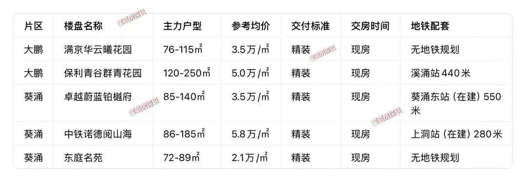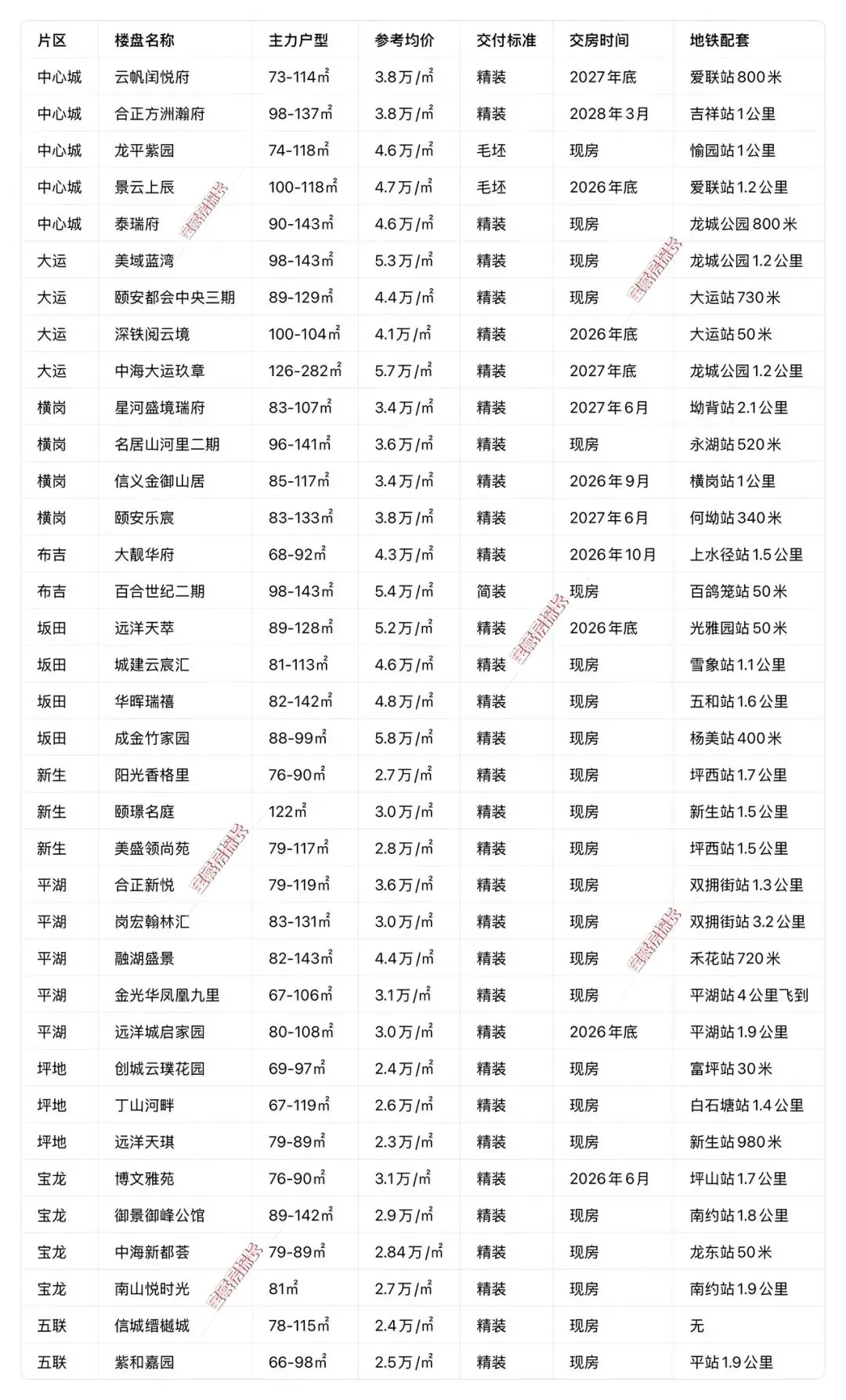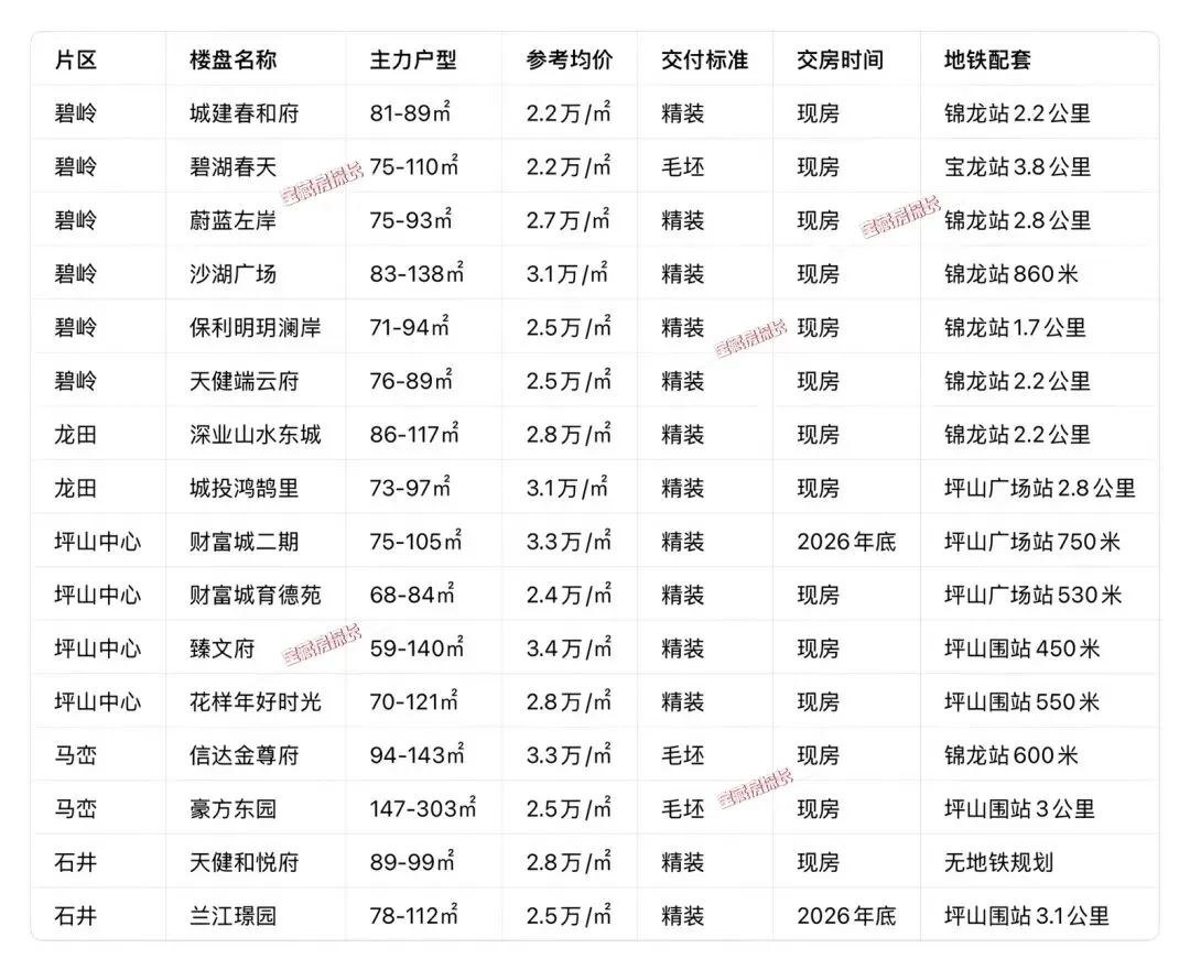 • 核心特点:片区新房成交绝对主力,流通性最好,覆盖龙岗中心城、横岗、坂田、平湖、坪山全片区