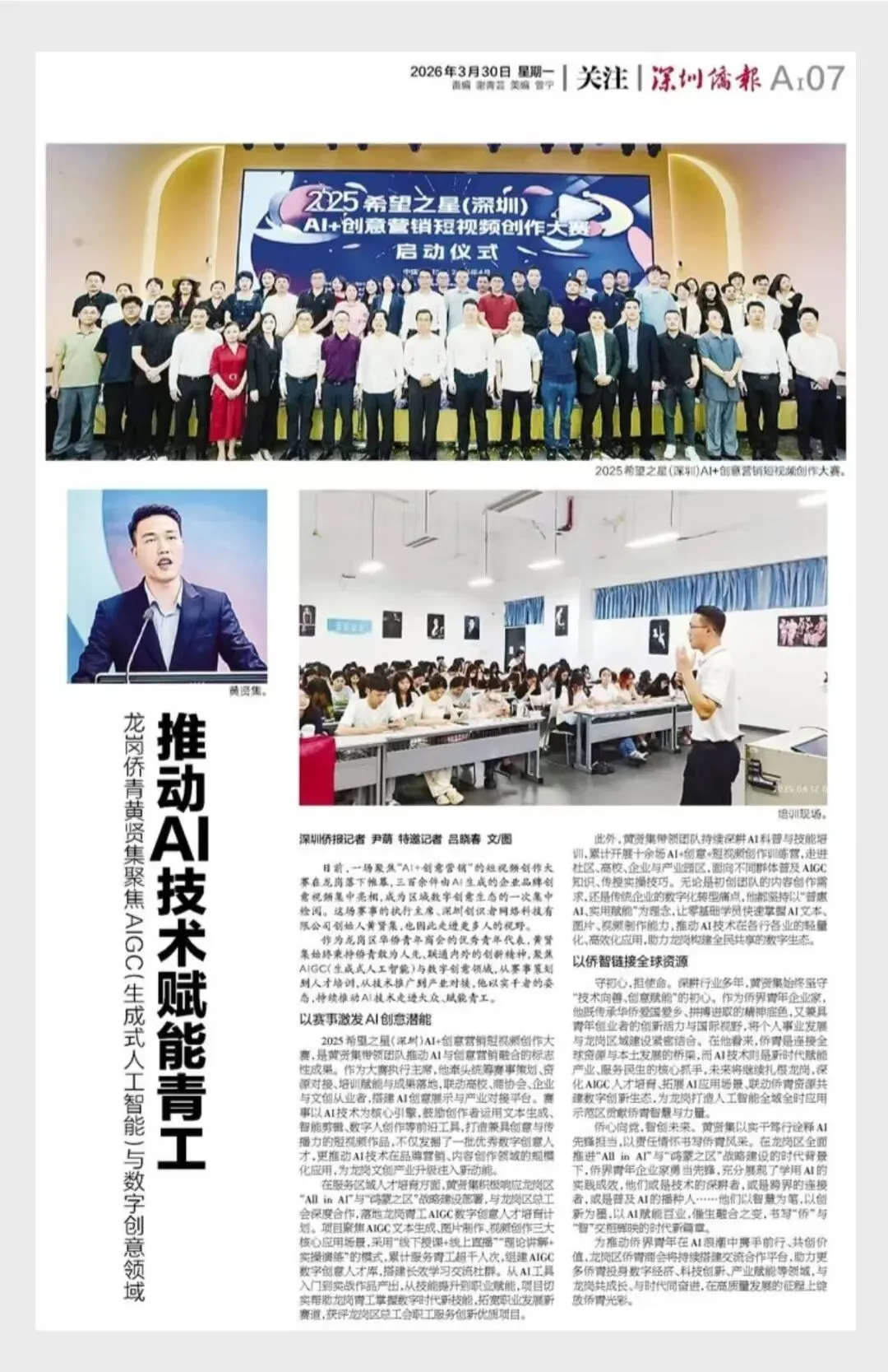 侨心向党,智创未来。黄贤集以实干笃行诠释AI先锋担当,以责任情怀书写侨青风采。在龙岗区全面推进“All in AI”与“鸿蒙之区”战略建设的时代背景下,侨界青年企业家勇当先锋,充分展现了学用AI的实践成效,他们或是技术的深耕者,或是跨界的连接者,或是普及AI的播种人……他们以智慧为笔,以创新为墨,以AI赋能百业,催生融合之变,书写“侨”与“智”交相辉映的时代新篇章。