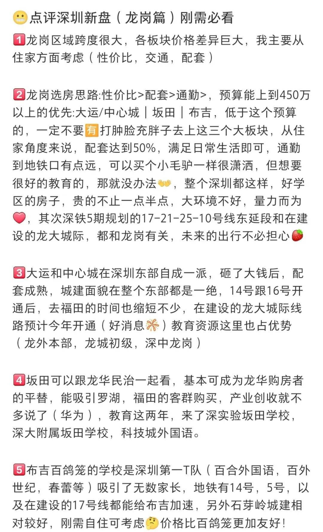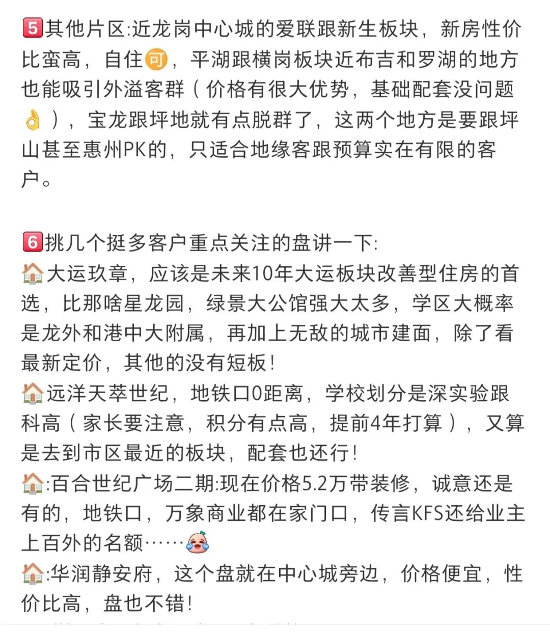 资产配置/长线持有者:坂田(电子信息产业集群)、大运(规划驱动型)抗风险能力最强。这类区域有产业和规划双重支撑,即便市场波动,核心资产也能稳住价值。