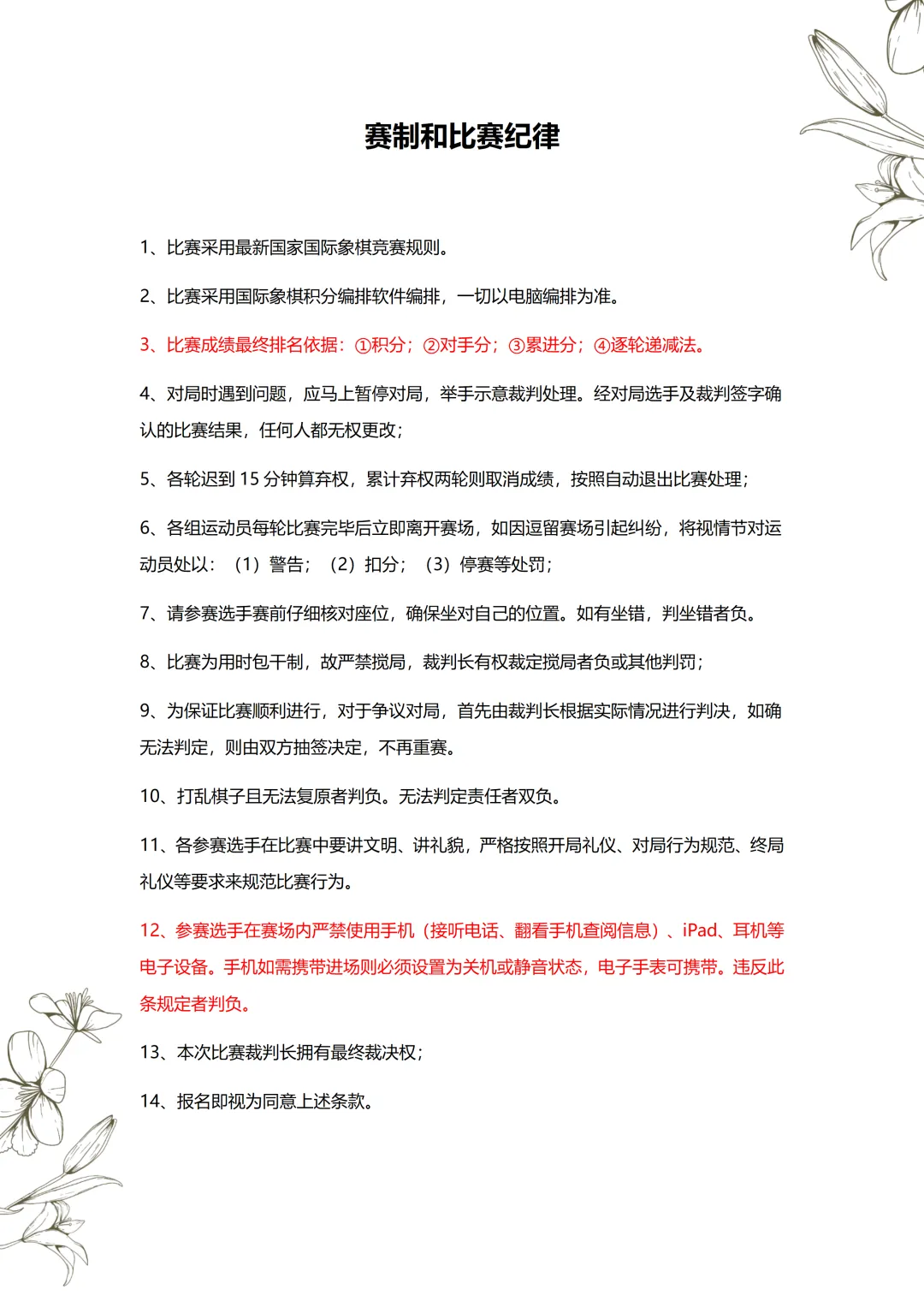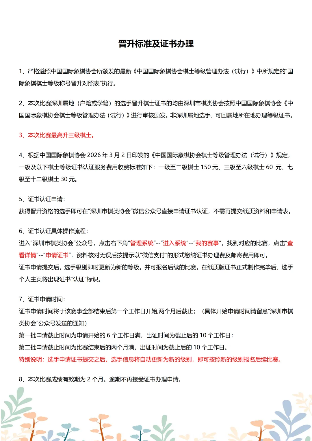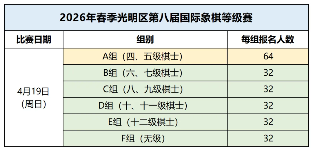1、凡在深圳工作、学习、生活的国际象棋爱好者均可报名参赛。3、报名所持原棋士等级证书必须是中国国际象棋协会监制的《中国国际象棋棋士等级证书》。4、报名参赛者须按现有棋士等级证书报名,不得跳级上报。1、A组比赛7轮,双方每局用时总和不少于60分钟。2、B-F组均比赛5轮,双方每局用时总和不少于40分钟。3、裁判可视比赛情况合理放置棋钟,中途放钟原则上每方不少于10分钟。各组男女分别录取前八名,冠军颁发奖杯、奖牌和证书,二至八名颁发奖牌和证书。1、报名截止时间:2026年4月14日中午12点,名额有限,报满即止。2、参赛费:260元(参赛费用不包含等级证书认证服务费)(2)报名截止日前2天内至报名截止日退赛,收取50元手续费;4、本次赛事的参赛费用由深圳市光明区国际象棋协会收款。赛事咨询及退赛联系电话: