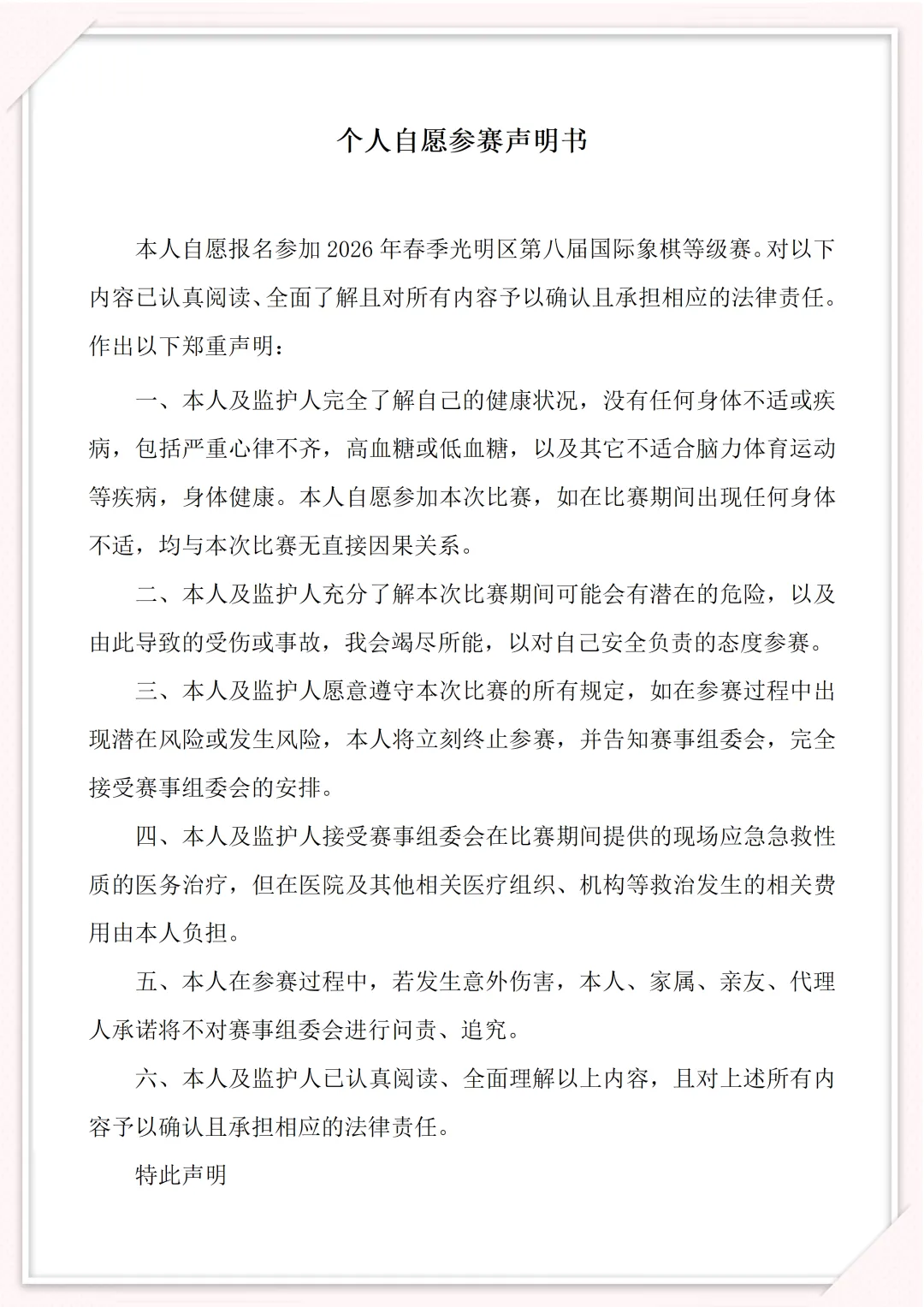 1、微信进入“深圳市棋类协会”微信公众号,并关注。点击右下角“管理系统”--“进入系统”。点击“选手资料”按照提示完成注册(注册时需要上传“身份证照片(带照片面)”、“电子版标准个人一寸照片”、“现有最高级别证书”)。(请事先准备好上述照片后再完善个人资料)。已完成注册的选手,在“管理系统--进入系统--网上报名”中选择【2026年春季光明区第八届国际象棋等级赛】点击“我要报名”按照提示完成报名。报名经系统审核通过后,可在“报名公示”中可查阅到的选手姓名,同时在“我的赛事”中显示选手报名成功的比赛。2、深圳市棋类协会赛事及证书管理系统免费注册。选手注册之后将可以及时查阅比赛信息、报名和申请证书。系统将完整记录选手的历次比赛成绩和证书的升迁过程。注册选手在比赛中家长也可以随时查阅孩子每轮的对阵和成绩。为避免占用比赛名额,请勿同时报名多个同等级别的赛事。报名成功后,组委会不接受选手等级更改的申请,如因实际等级与参赛组别不符,一经发现,一律取消其比赛资格和成绩。1、各选手应按规定的比赛时间建议提前30分钟到达比赛场地。2、比赛组委会统一为参赛选手、裁判人员、工作人员购买比赛期间的赛事公众责任险。3、凡报名参赛必须详细阅读并同意《个人自愿参赛声明》;并遵守声明中的规定;4、选手有义务参加赛事的开幕式、闭幕式、颁奖仪式等;5、为保障选手安全,组委会统一整队集体带至家长接送区,以组委会公告为准。6、组委会保留对本次赛事规程的解释权和根据实际情况的调整权。