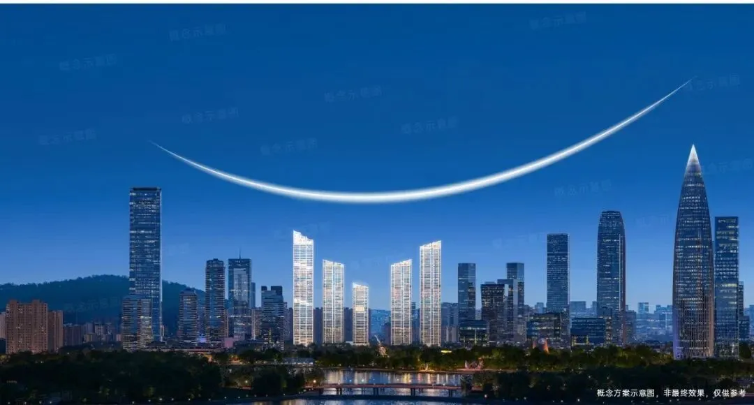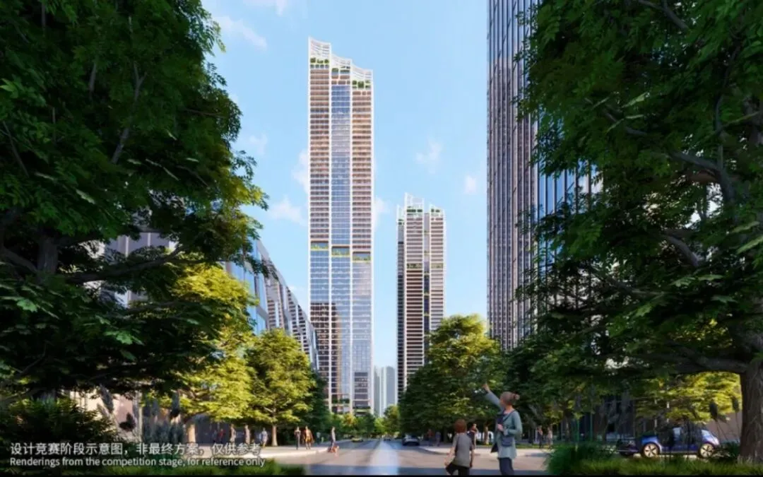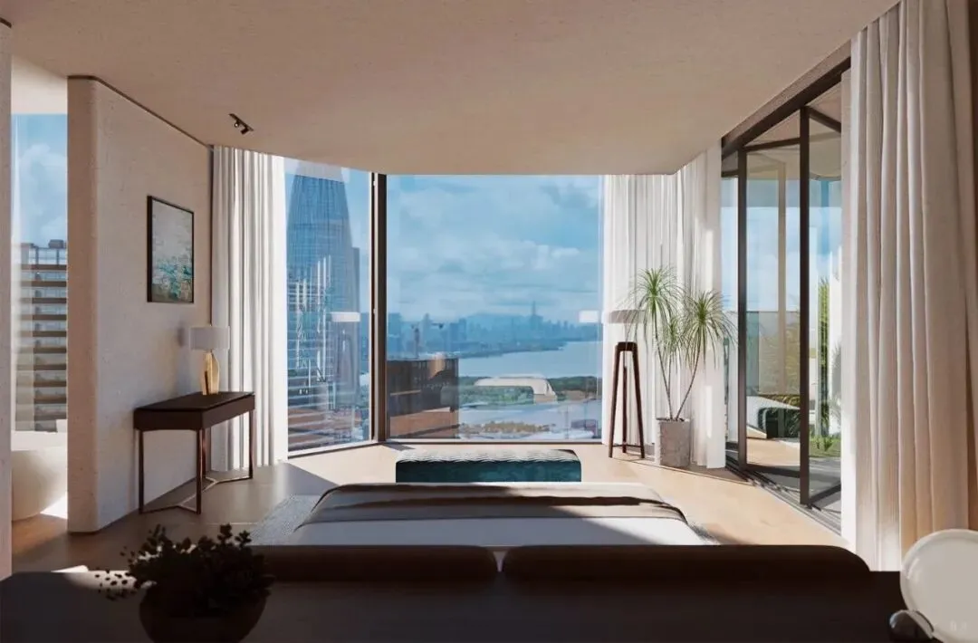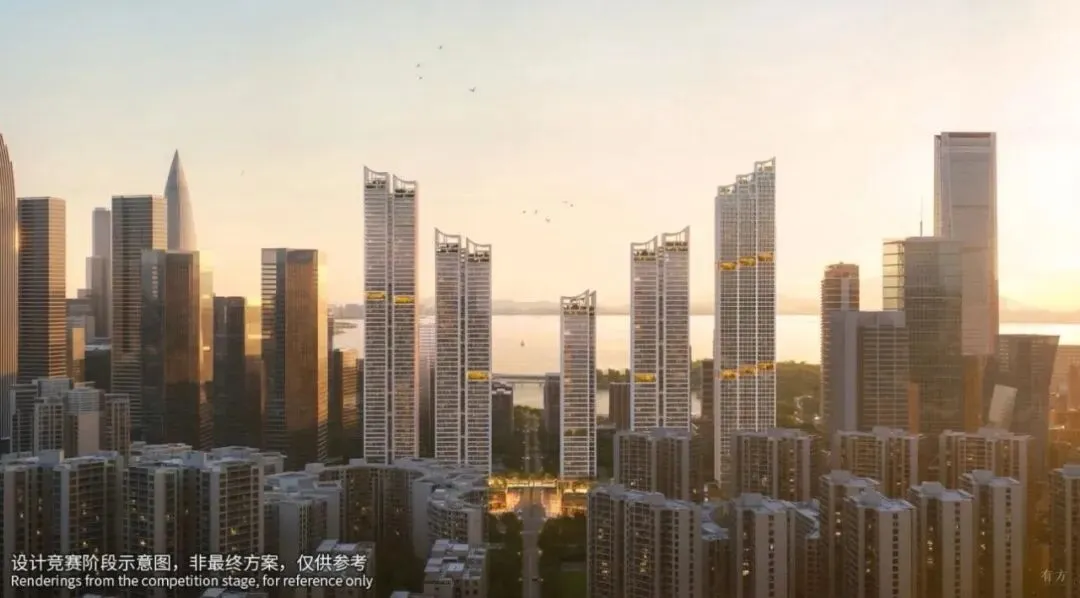项目由五座150-250米塔楼组成,区别于周边规整垂直的传统塔楼,采用错落布局和平面退台设计,以优化深圳湾景观视野,塑造出更加立体、有机的城市天际线。