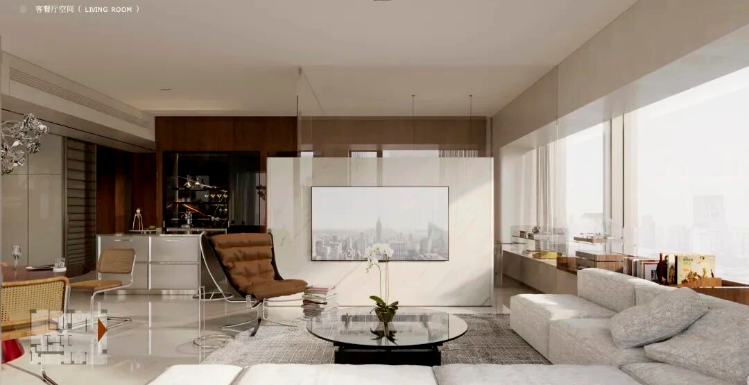 建筑外立面线条简洁硬朗,采用全玻璃幕墙设计。户型内部拥有超大阳台,配以绿植,强调自然与居住融合,打造立体绿洲。