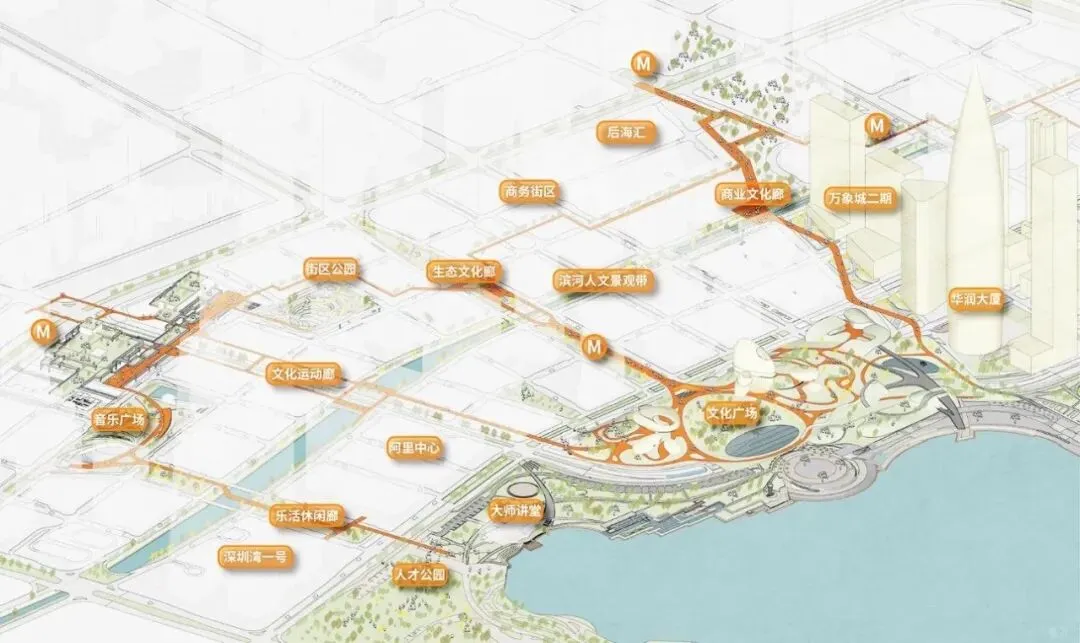 另外还有连接整个深圳湾的步行系统,小区多层次底花园和周边花园通过市政连廊,形成一个贯穿式的生态连廊接通深圳湾所有的配套,包括商业、写字楼、中心河、人才公园等,都是轻松慢行可以通达。