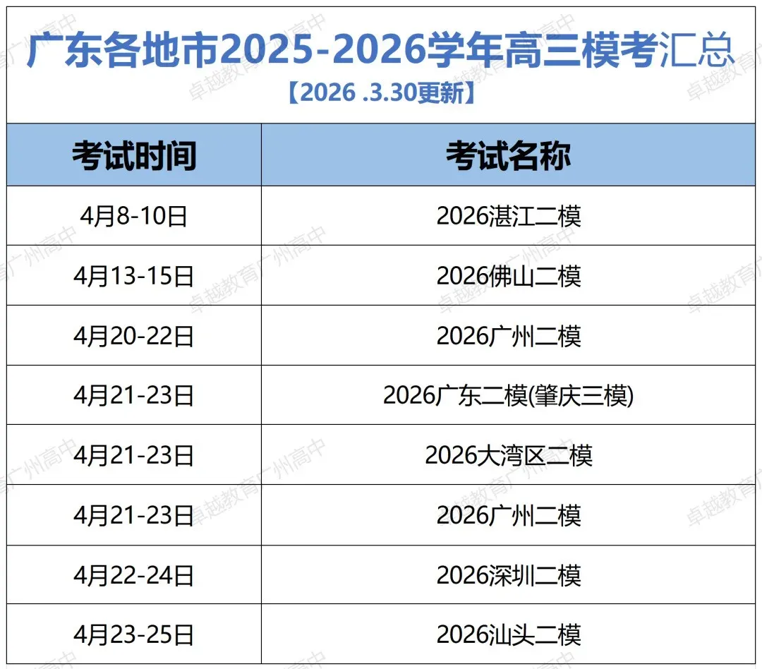 目前已确定的有佛山二模、广州二模、广东二模、大湾区二模、深圳二模等8场,我们整理了最新2026届高三二模安排,需要的同学速速收藏~