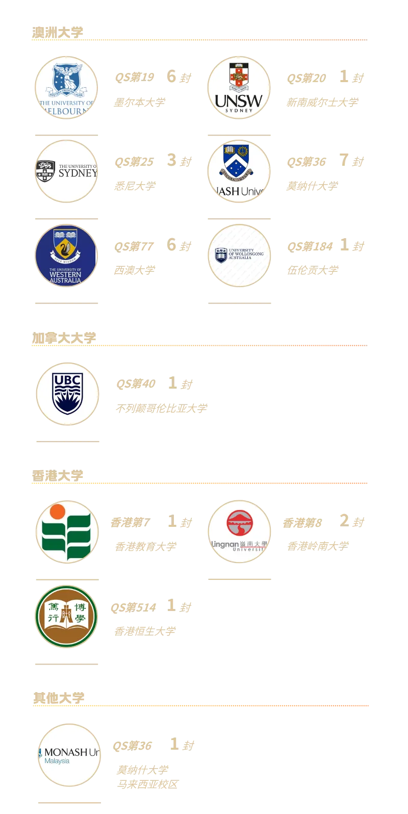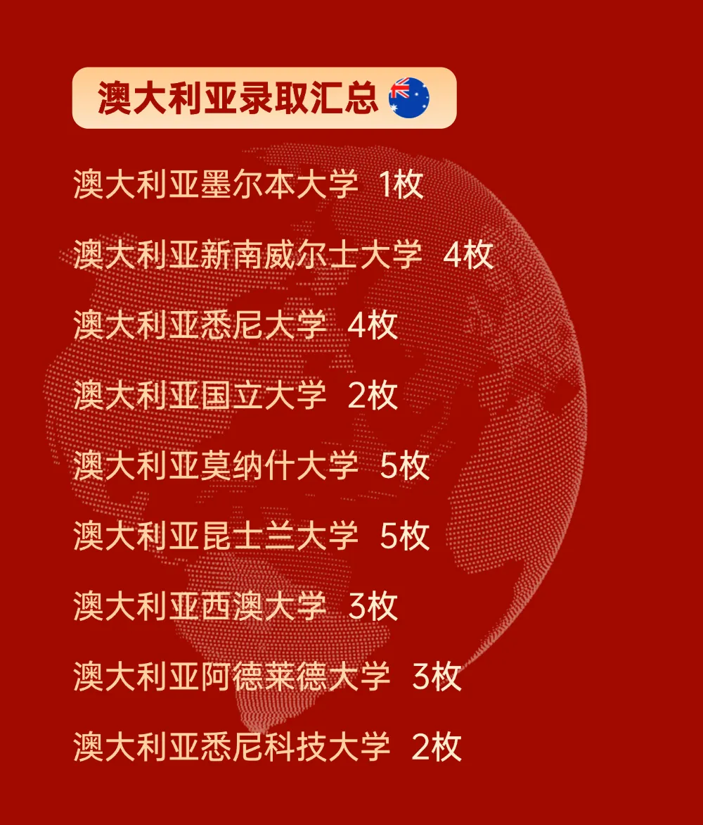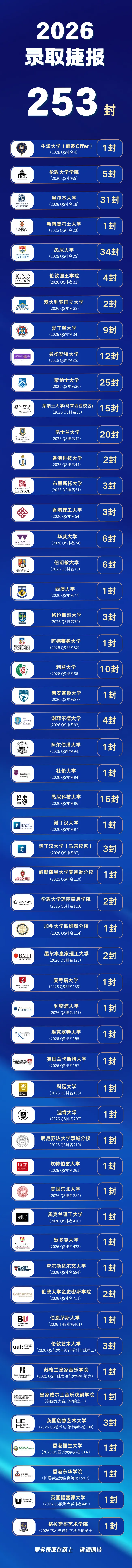 澳洲八大录取稳居领先,拿下31封墨尔本大学(2026 QS排名19)、34封悉尼大学(2026 QS排名25)、2封澳大利亚国立大学(2026 QS排名32)、24封蒙纳士大学(2026 QS排名36)、20封昆士兰大学(2026 QS排名42)、16封悉尼科技大学(2026 QS排名96)等澳洲名校Offer。