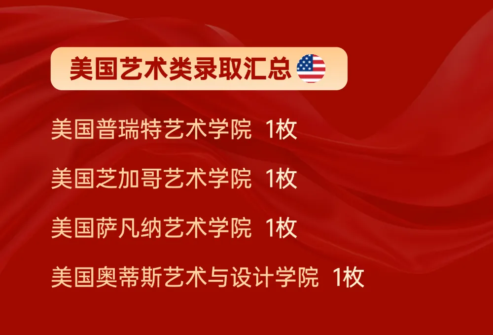 世界名校AP课程艺术方向学生历来深受世界艺术院校青睐,2026届一举收获美国普瑞特艺术学院、萨凡纳艺术与设计学院、芝加哥艺术学院等多所全球艺术类排名前十的名校的录取。自2017年起,世界名校AP班艺术方向学生持续领跑,录取涵盖QS排名第二的伦敦艺术学院与第三的美国罗德岛设计学院等世界级名校。