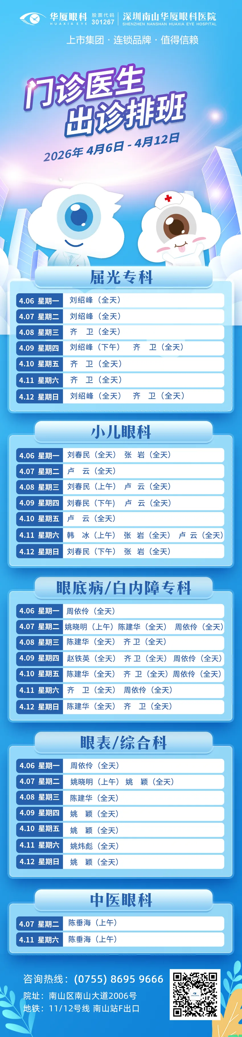 深圳南山华厦眼科医院4月6日——4月12日专家排班