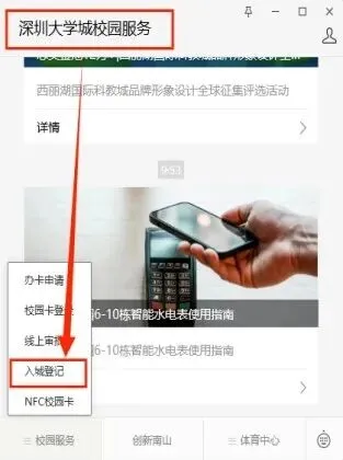(2)【自驾车登记】:关注“深圳大学城校园服务”公众号,点击菜单栏的“入城登记”填写信息。如果驾车,登记车牌号码即可。