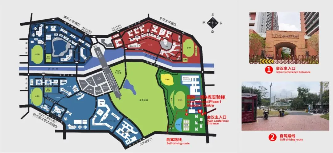 ①乘坐地铁5号线(环中线)在“大学城站”下车,自B出口上至地面,步行207米至“红花岭”公交站换乘74/81路公交车,在“丽水路南站”下车,步行约100m至清华大学国际研究生院一期东门进入A栋会场。