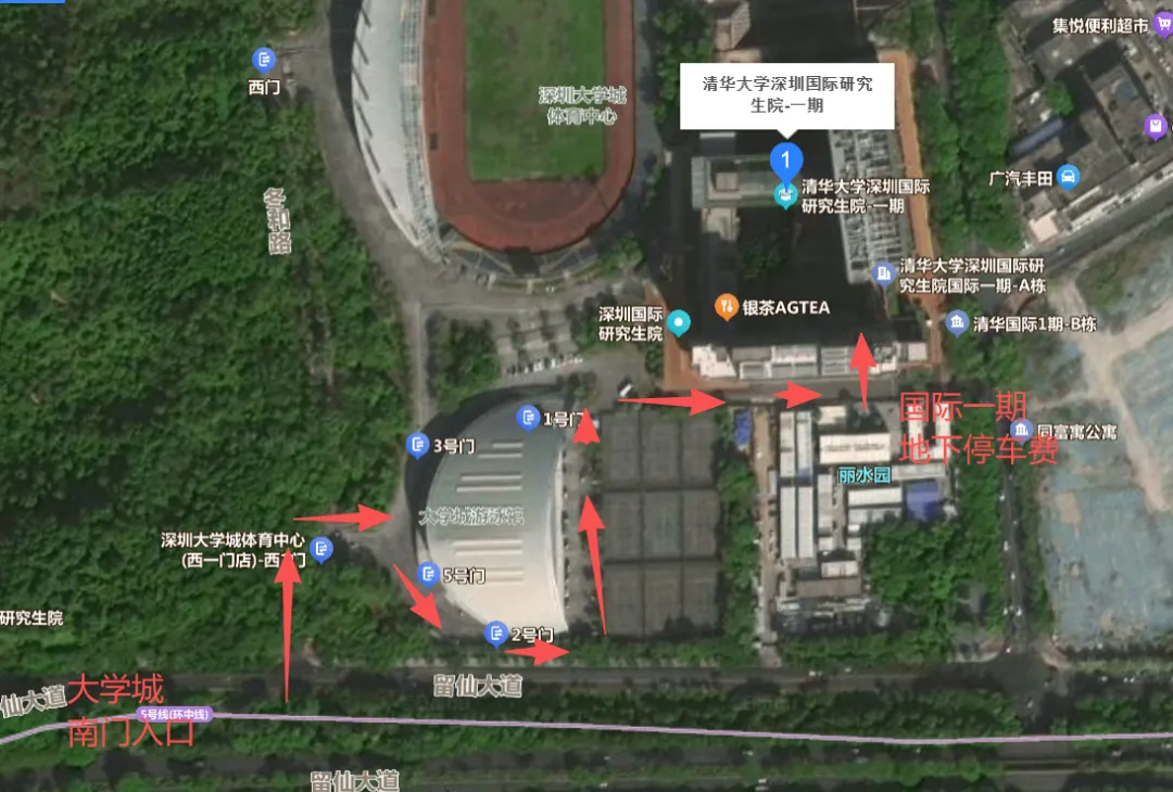 导航至【深圳大学城体育中心(西一门店)-南门】—— 直行30米右转 —— 进入大学城游泳馆正门——按道路指引进入国际一期地下停车场/停在游泳馆周边,步行至国际一期A栋,乘坐电梯到3楼报告厅。