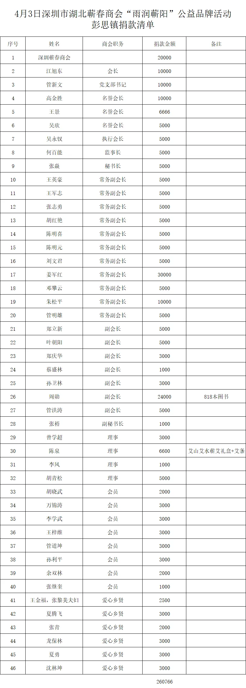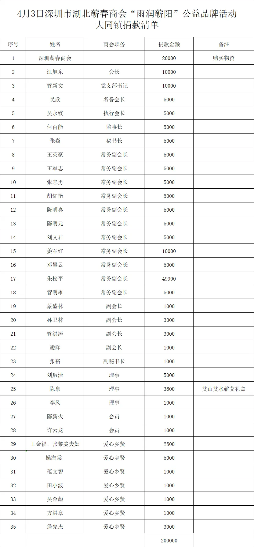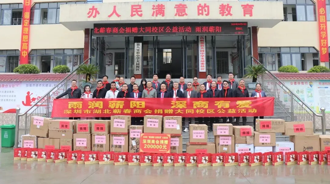 4 月 3 日,深圳市湖北蕲春商会在会长江旭东带领下,四十余名爱心会员返乡开展 “雨润蕲阳” 公益行动,先后走进大同镇、彭思镇,以真情实意反哺故乡,现场捐赠善款及物资约50万元。
